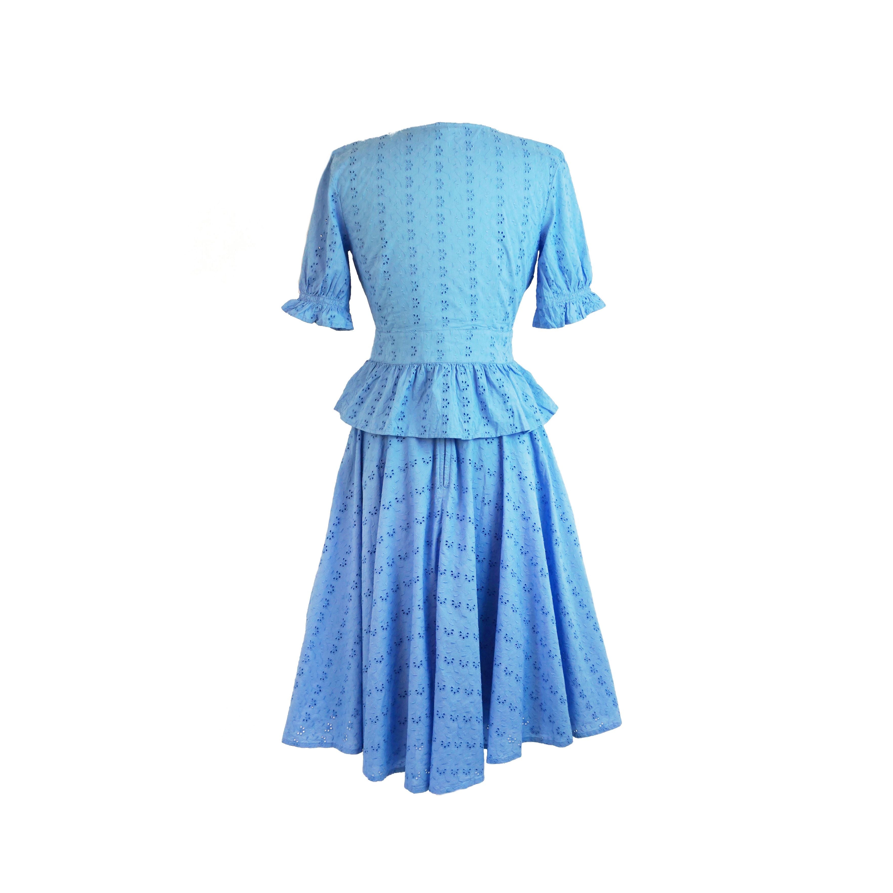 The Jolene Blouse is made from beautiful blue, broderie anglaise fabric, offering a fresh and feminine feel. Featuring voluminous puff sleeves with elasticated cuffs, a flattering V-neckline, and delicate button-down detailing, the silhouette is cinched at the waist with a wide band. 100% cotton.
