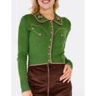 Cowgirl vibes abound in this charming green and pink western cardi with rose embroidery on the collar. The shellac buttons give a nod to traditional metal snaps and the rib waistband and cuffs ensure a perfect fit. Made of nylon viscose blend, this cardi can be dressed up or down, paired with an underlayer or worn on its own. Regardless, you are sure to get compliments and be in a good mood wearing this beauty!