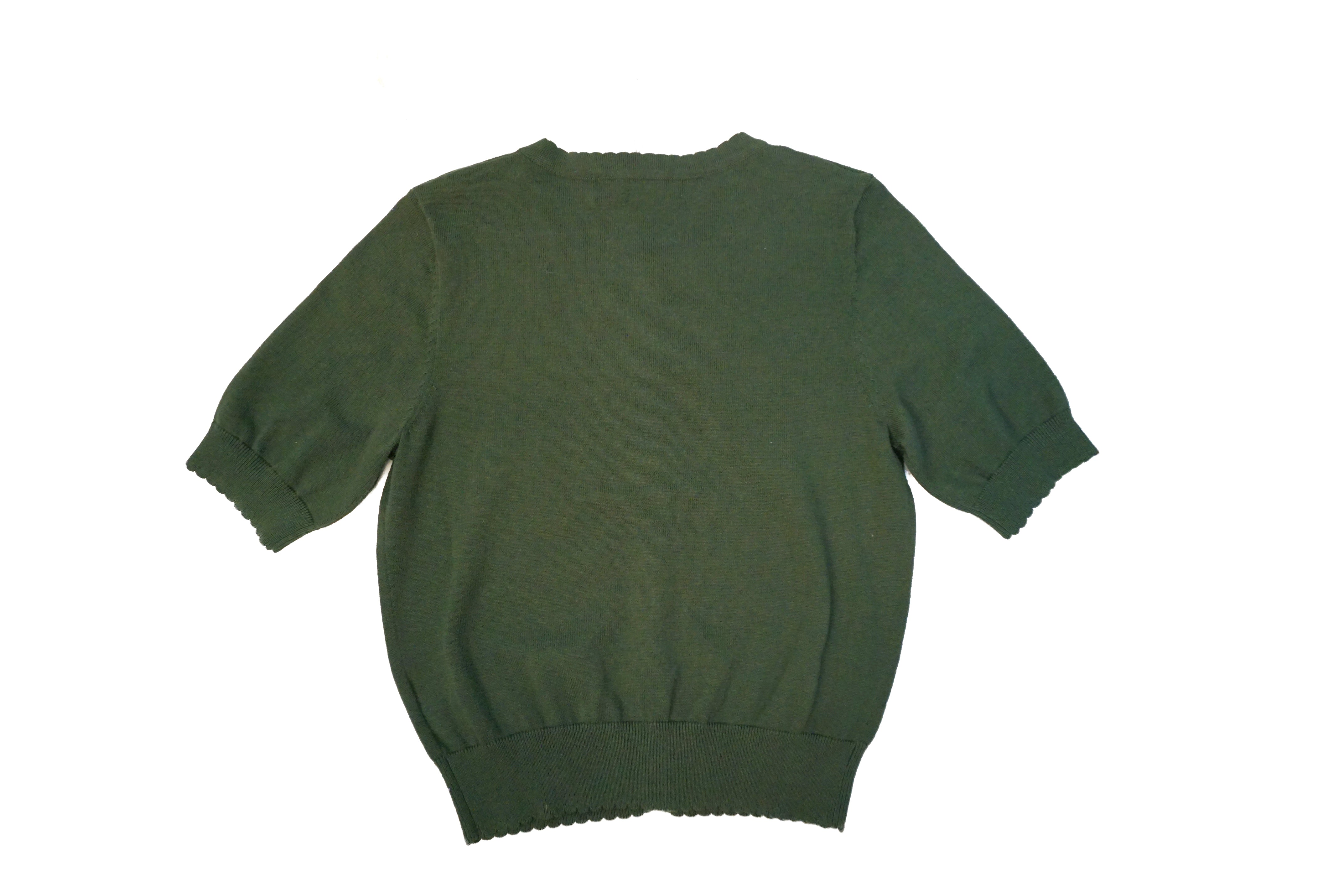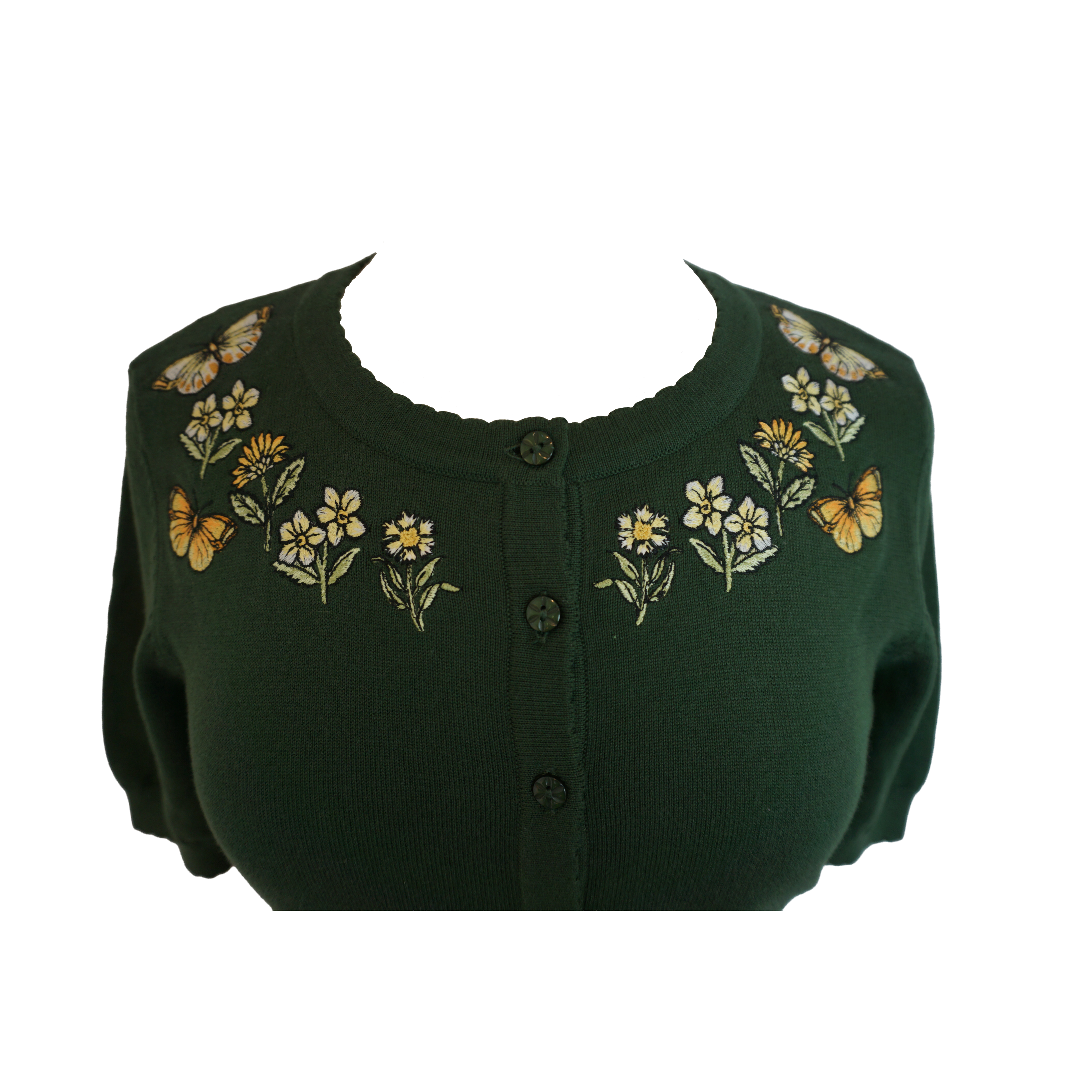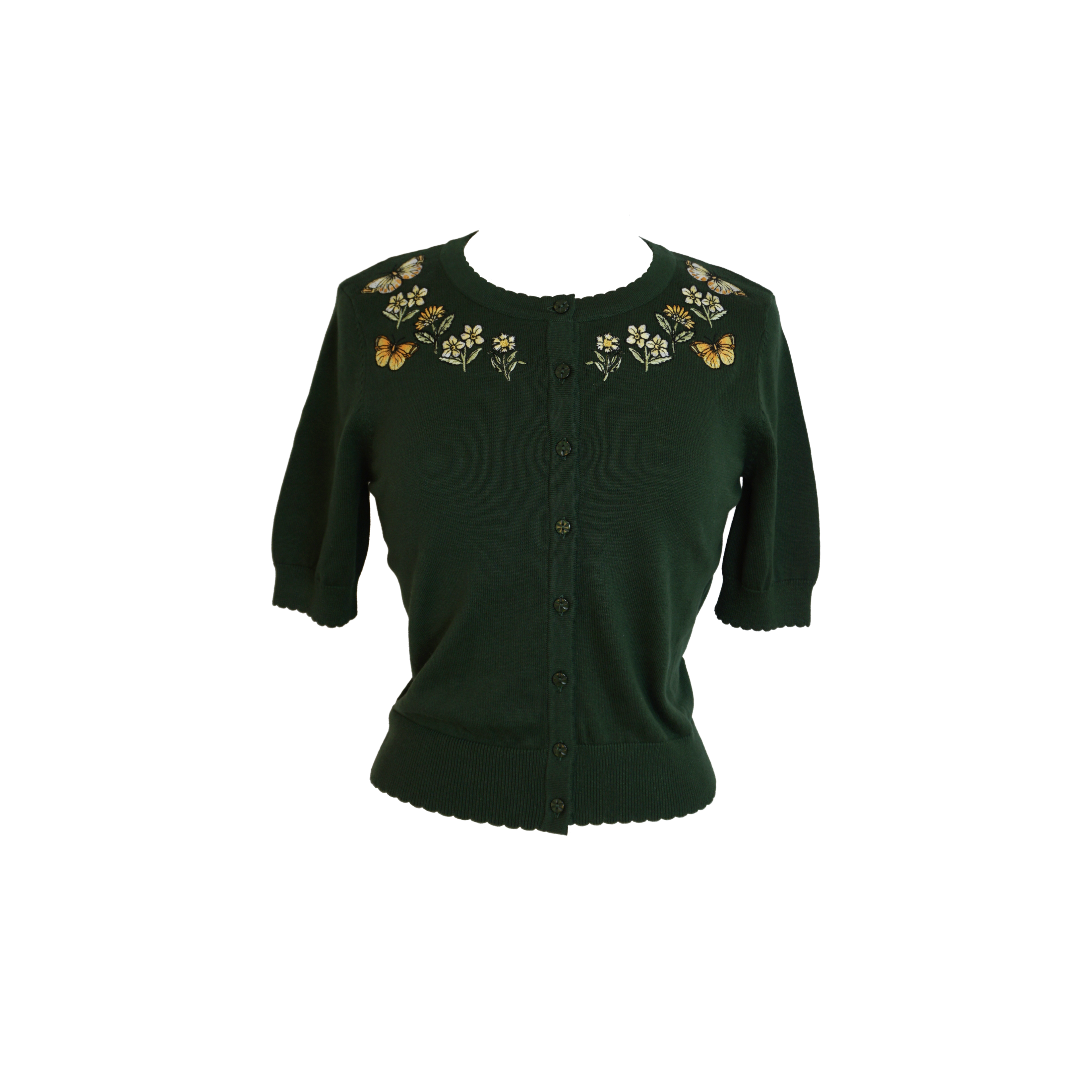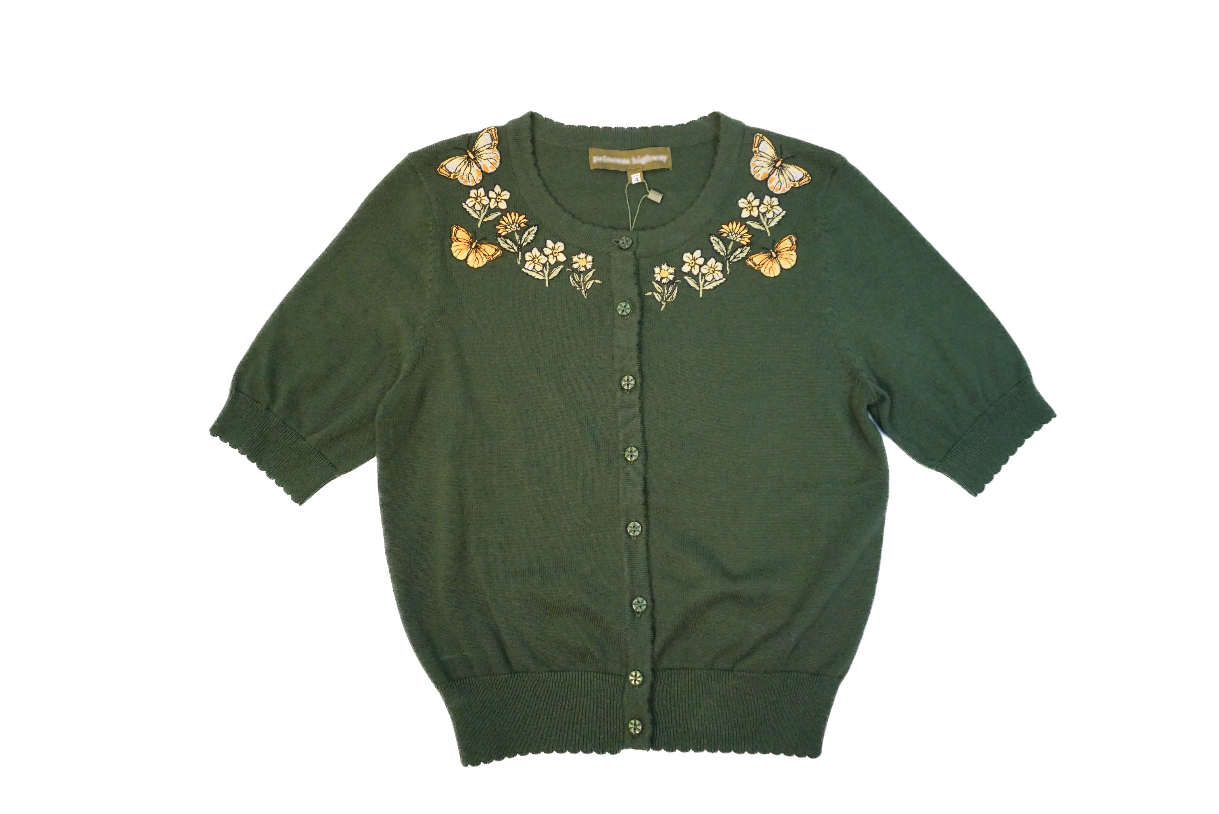 This short sleeve dark green cotton cardigan, embroidered with sunny yellow butterflies & flowers, is the perfect transition piece into Fall. Scalloped edges on the neckline, sleeves and bottom add even more sweetness to this round neck cardi!