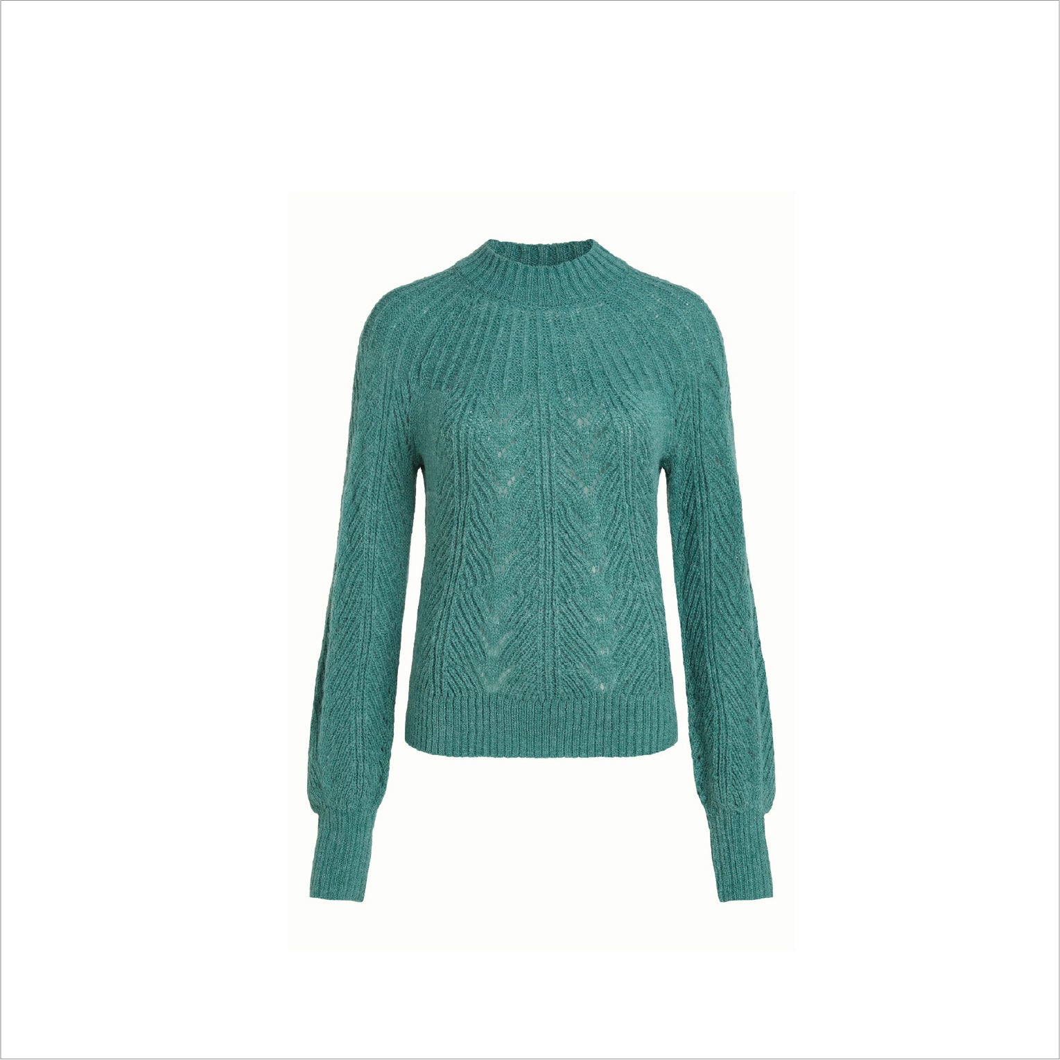 The Joanie Sweater in Smoke Green combines a stylish open-knit yoke with ajour knit detail ("Openwork") long sleeves, and a round neckline. This sweater offers comfort and a flattering fit, perfect for adding a chic, breathable layer to your wardrobe.
