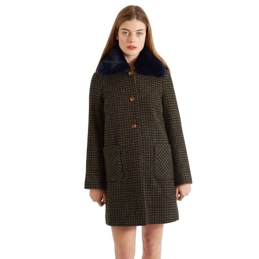 Elevate your winter wardrobe with the Dryden Warwick check coat! Crafted from a wool-rich navy and mustard mini check complete with a luxurious navy faux fur collar! With two large patch pockets, this lined A-line coat provides the necessary warmth and style to brave the coldest of days.