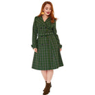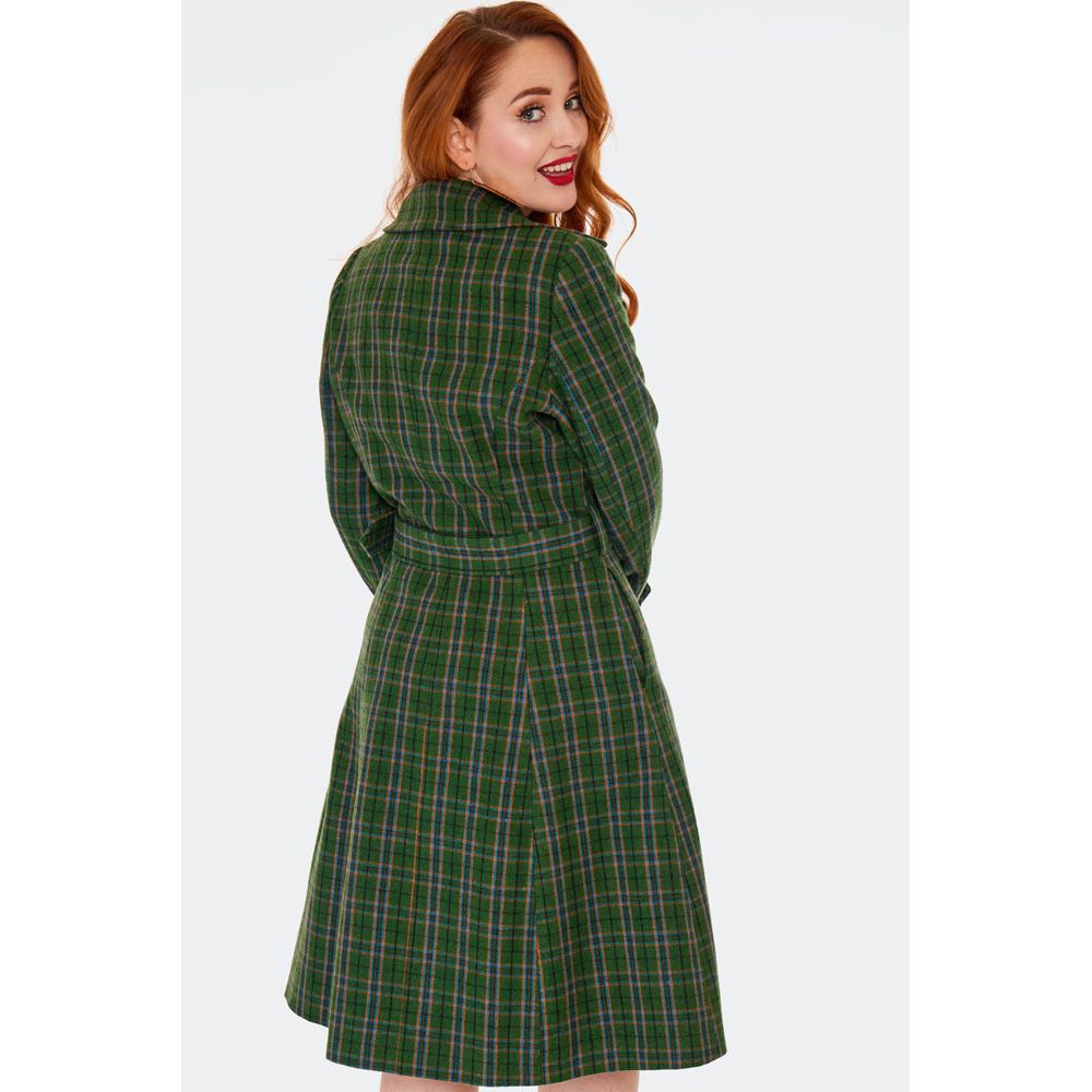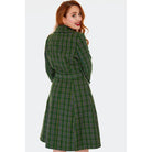 We love this Green plaid double breasted coat! With a blend of forest green and olive, the base of this coat works as a neutral for your wardrobe. Hints of blue, peach and black make this coat pretty as well as functional. With cuffed sleeves and a matching belt, this might just be your new favorite coat!