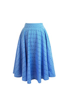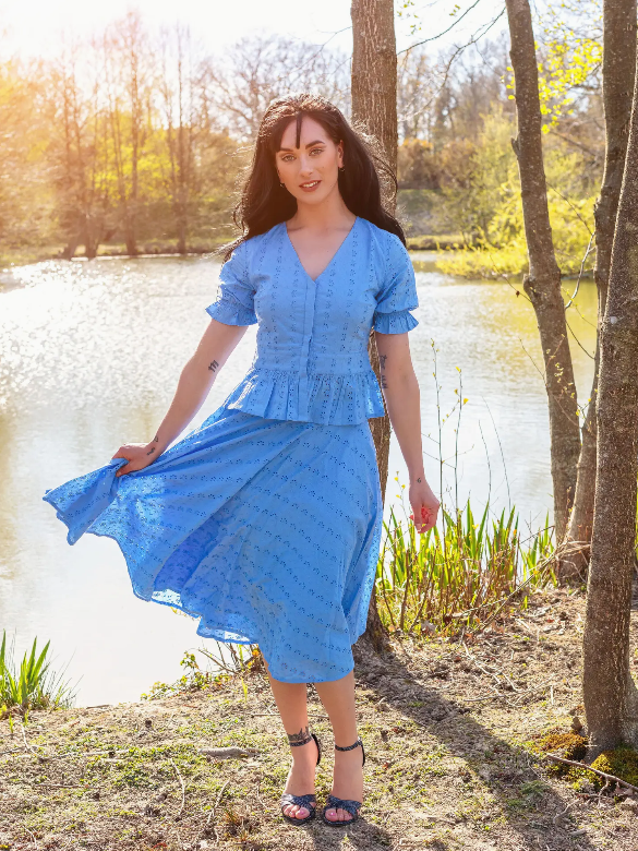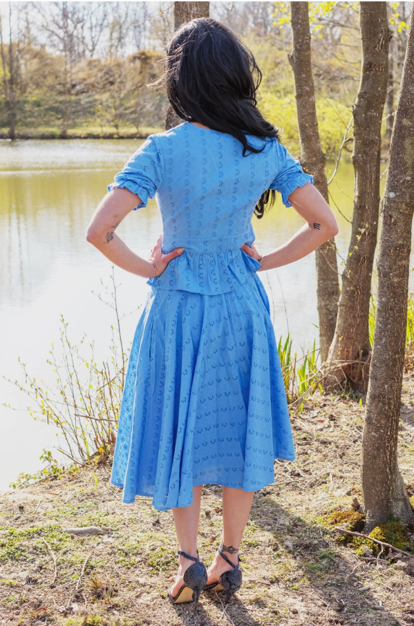 The Angelina Skirt crafted from our luxurious blue broderie anglaise, this skirt falls below the knees, lined with a complete vintage appeal. Outfitted with a back zipper and POCKETS! And 100% cotton. Pair it up with the matching Jolene shirt, Perfect for a spring picnic.