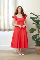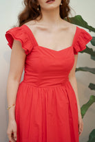 Indulge in luxury with our sustainable BCI stretch cotton poplin dress, perfect for any special occasion. The intricate ruffled sleeves beautifully frame a romantic fitted bodice and waist, creating a flattering silhouette that will leave a lasting impression at weddings, cocktail parties, and romantic dinners. Elevate your style and make a statement with elegance and sophistication!