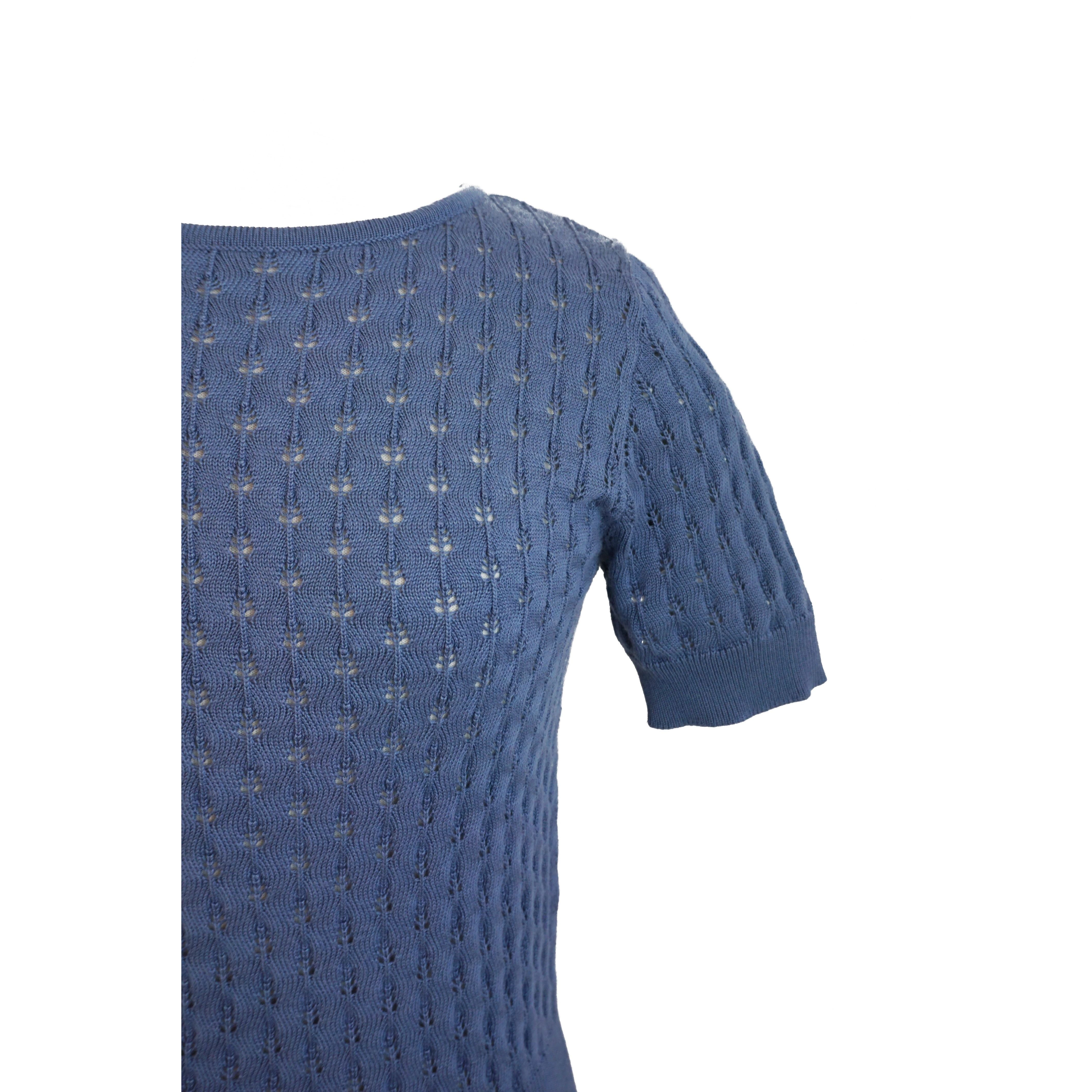 The Ella top is a lovely knitted sweater in a soft muted lavender color. This top has short sleeves, a round neck, and an openwork lace motif. Thanks to the cuff at the bottom, the sweater combines beautifully with our skirts or high-waisted pants, such as the Marlene Pants!