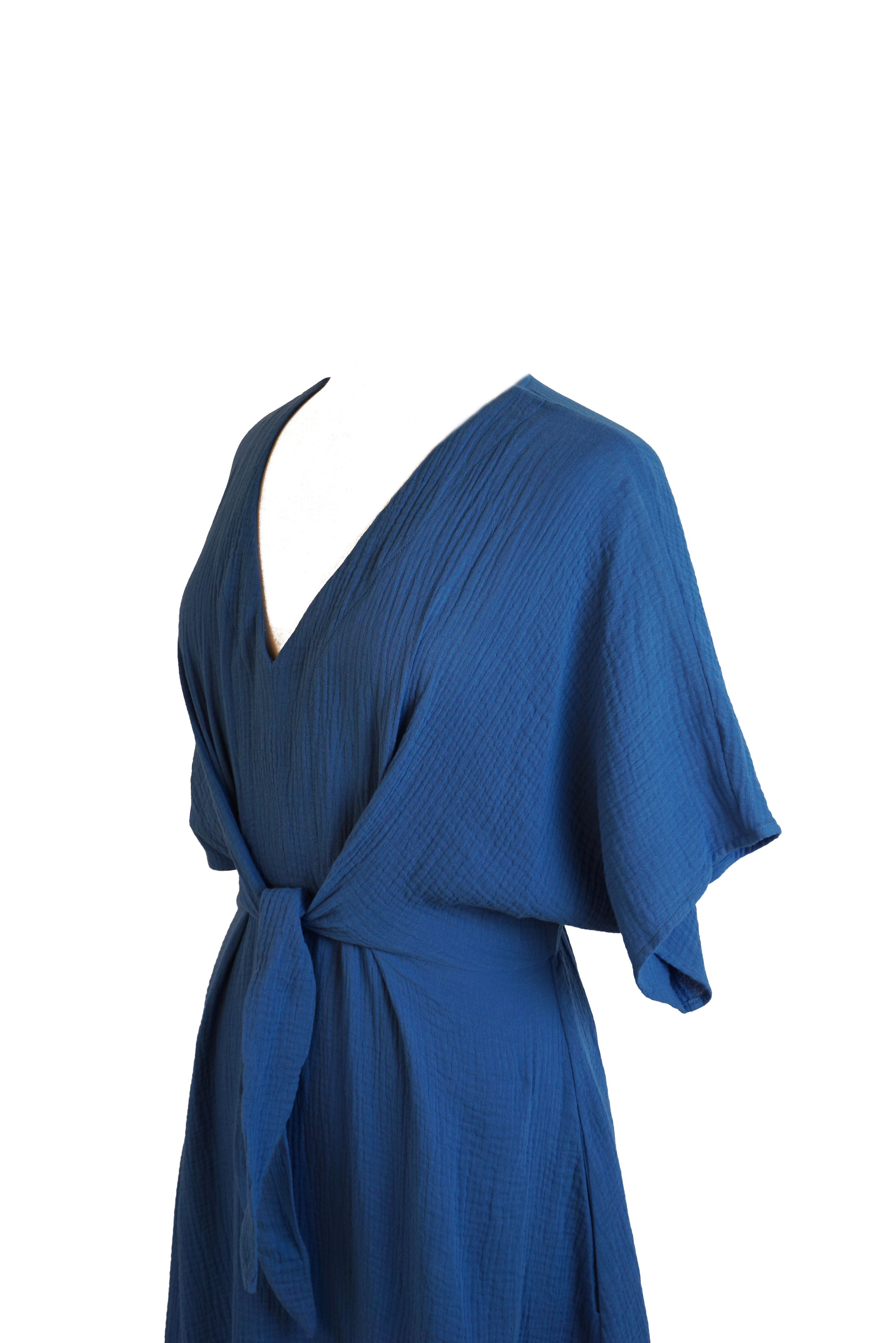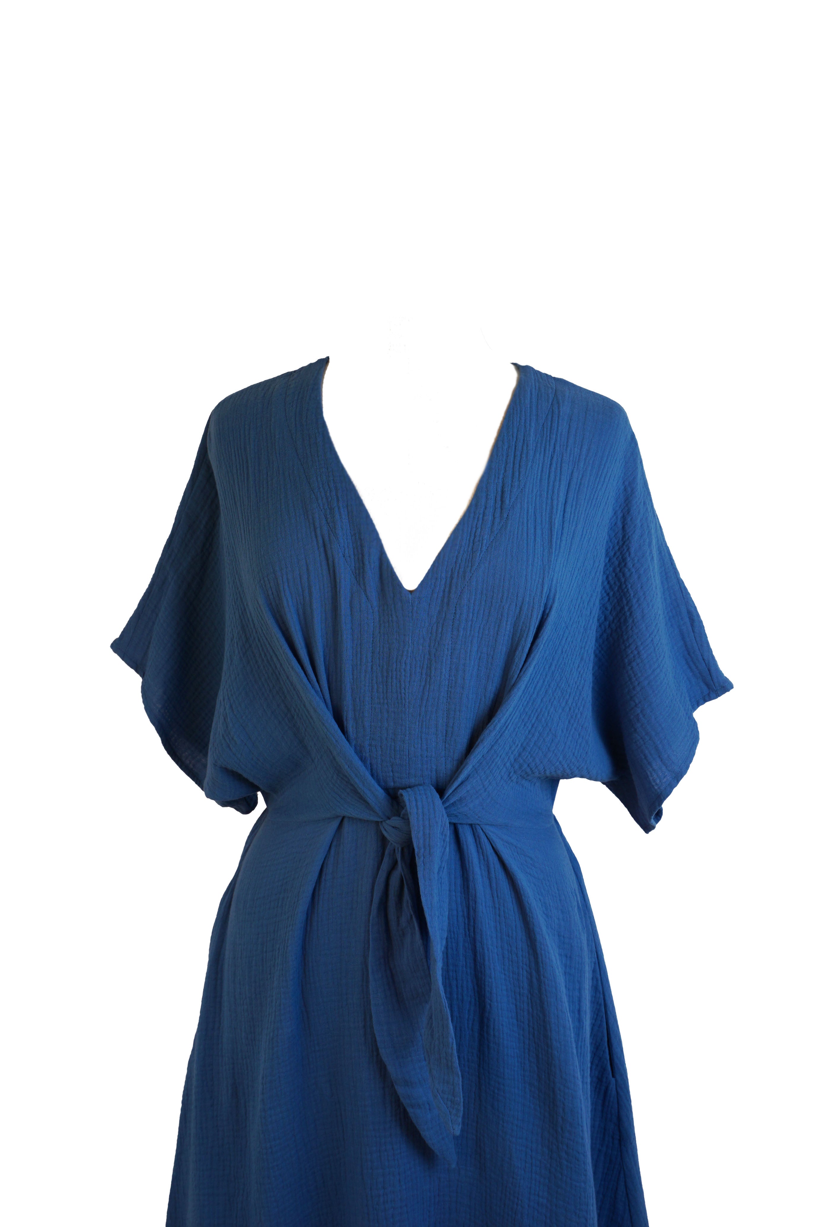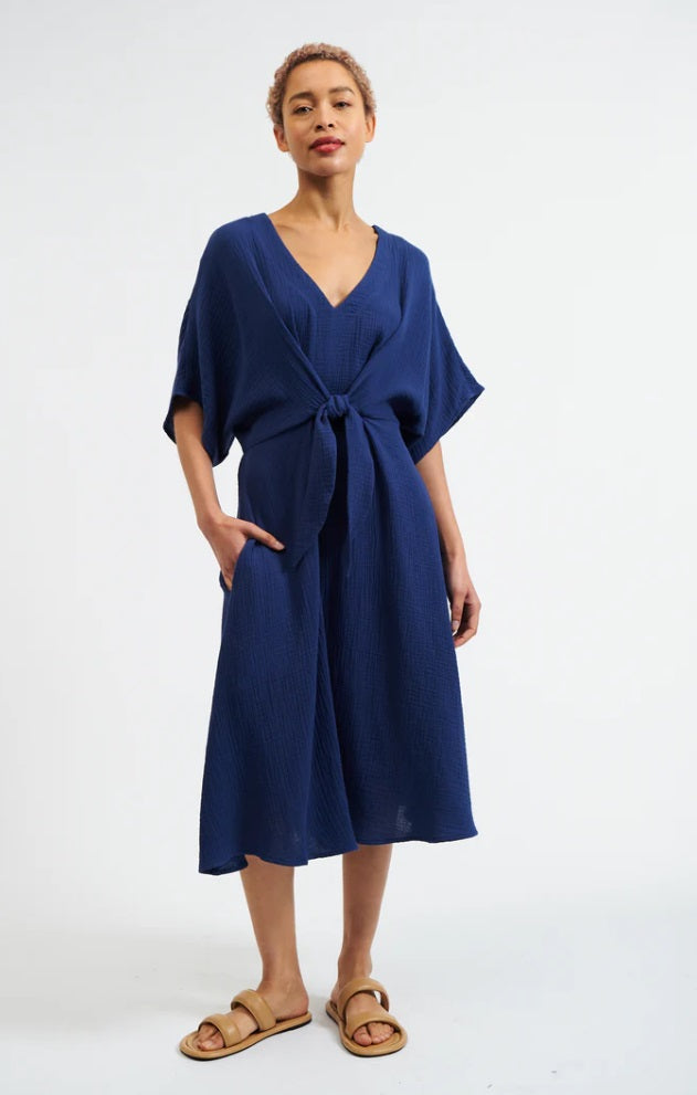 The Elody Double Gauze tie waist midi dress in deep navy is your new summer go-to. Made from super soft cotton double gauze, this dress offers a relaxed fit and kimono sleeves for all-day comfort and style. Perfect for any occasion.