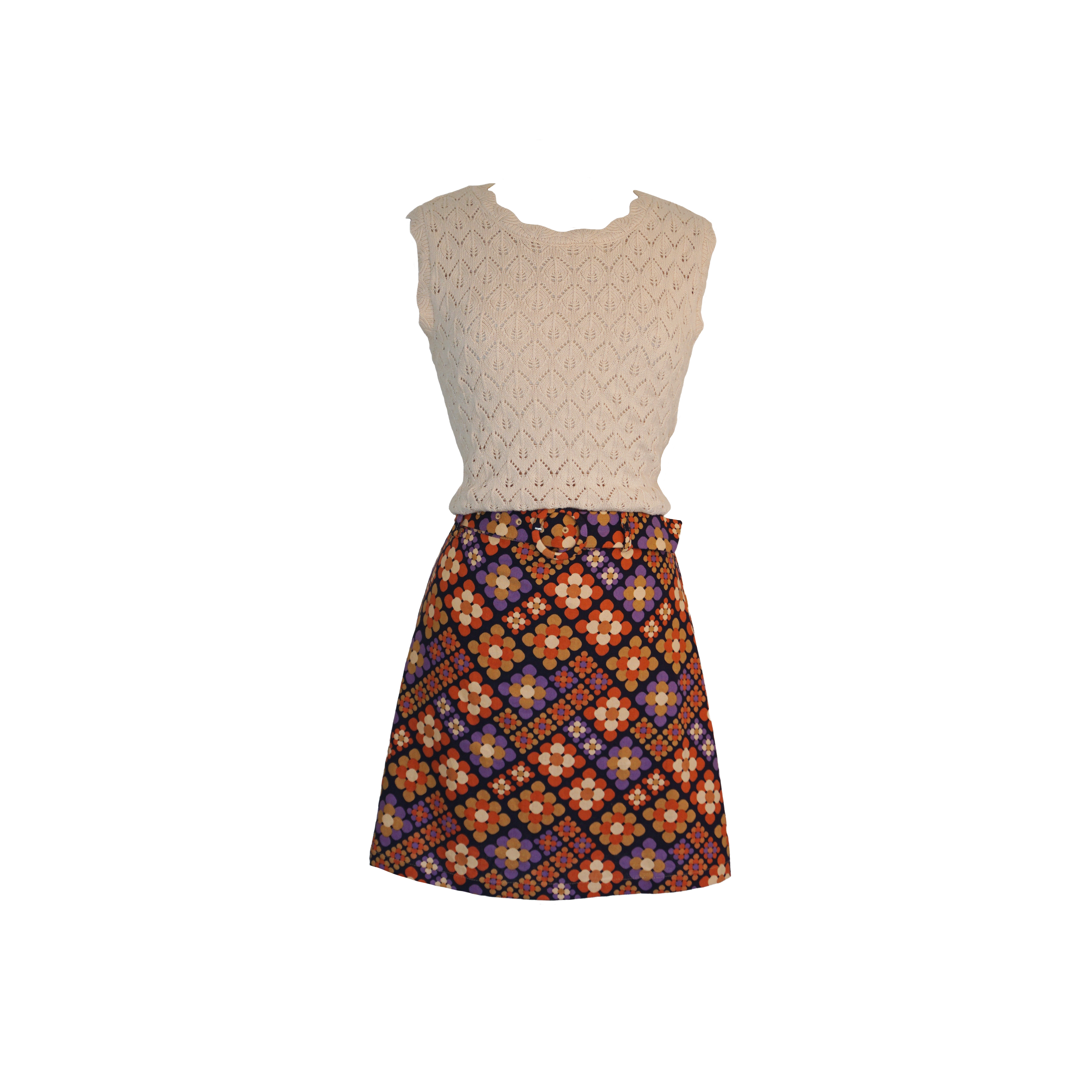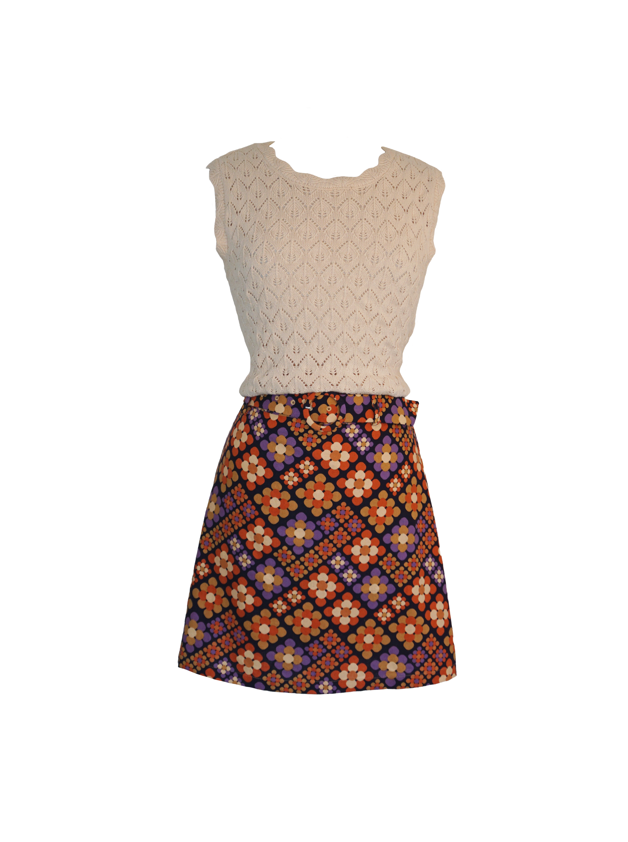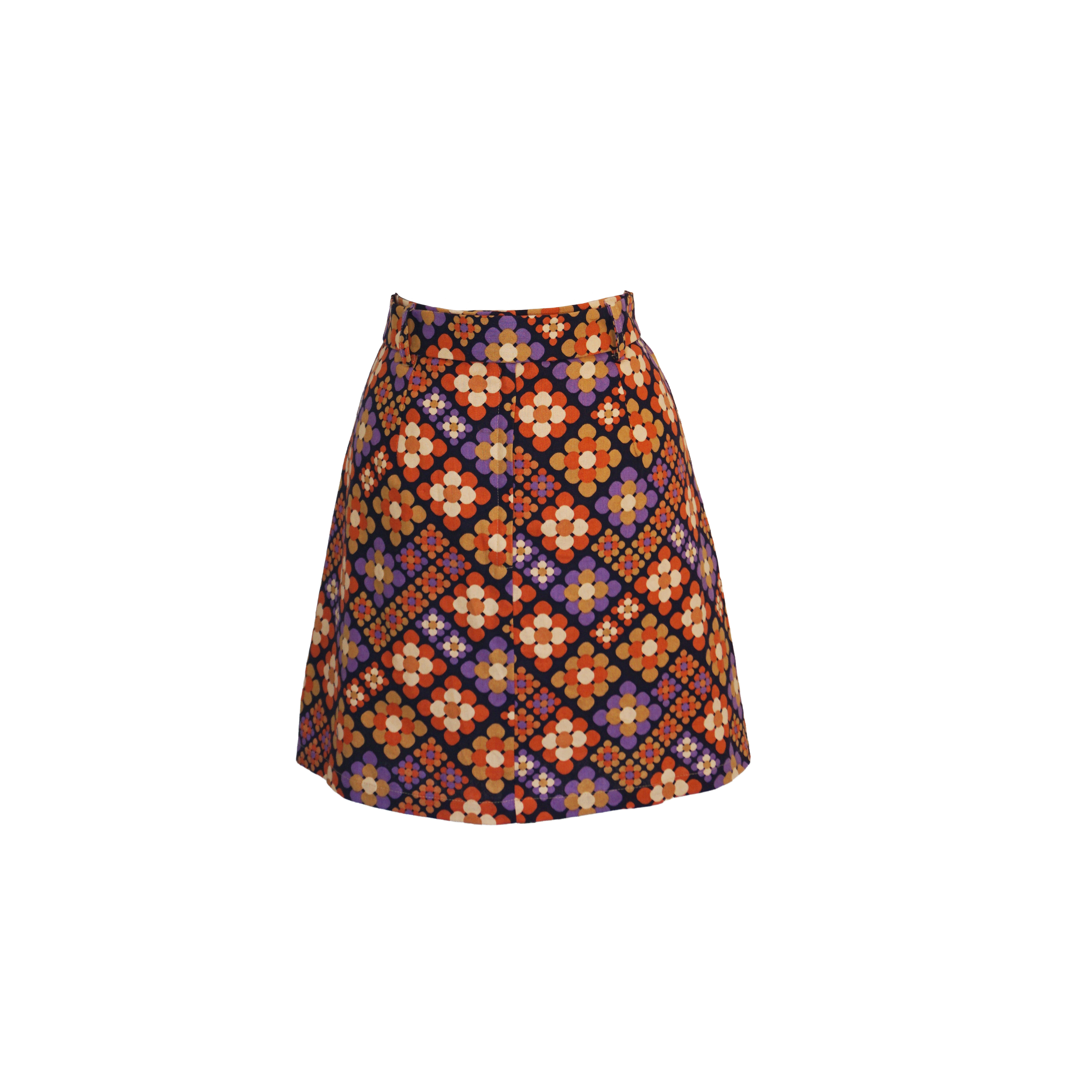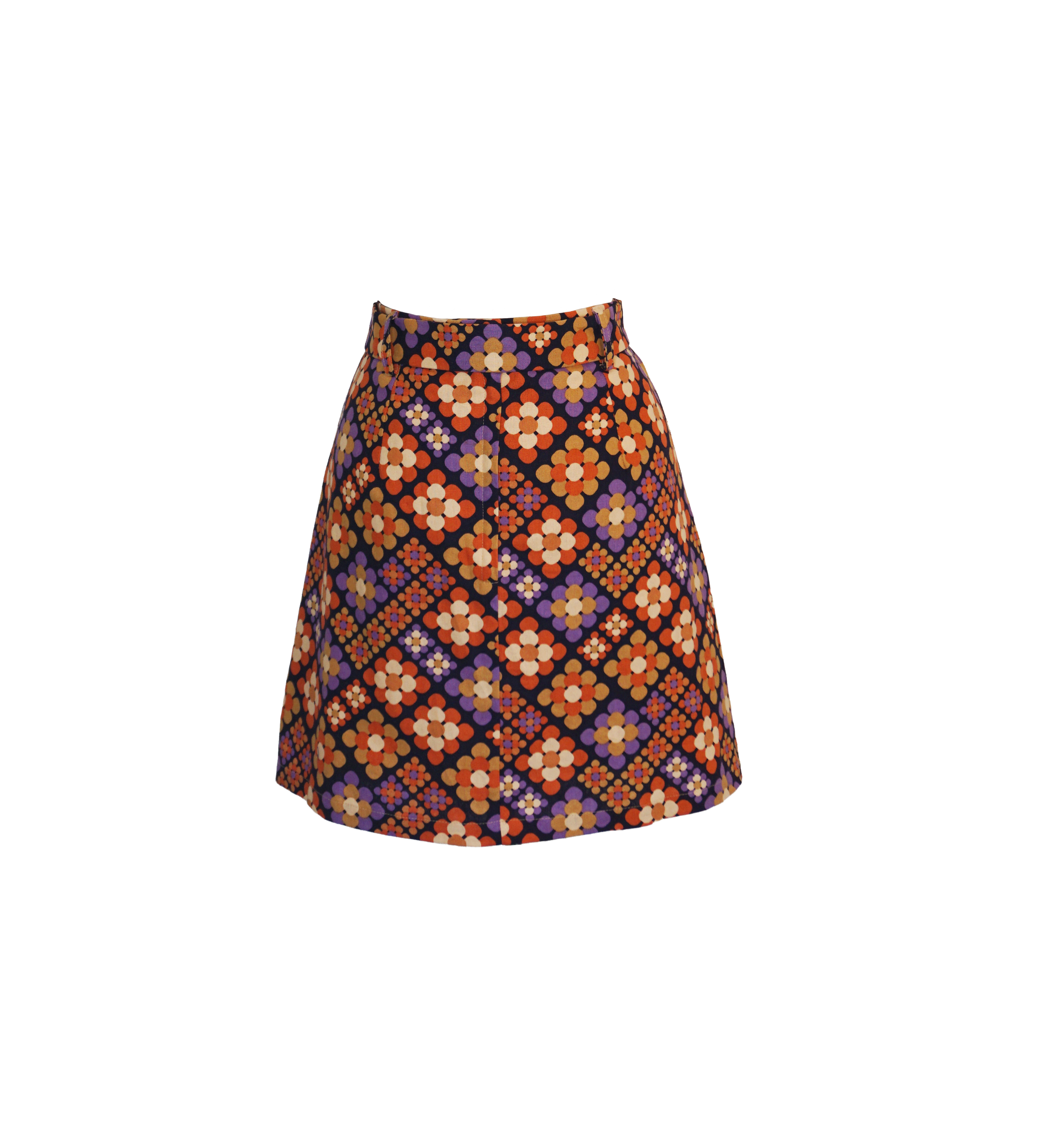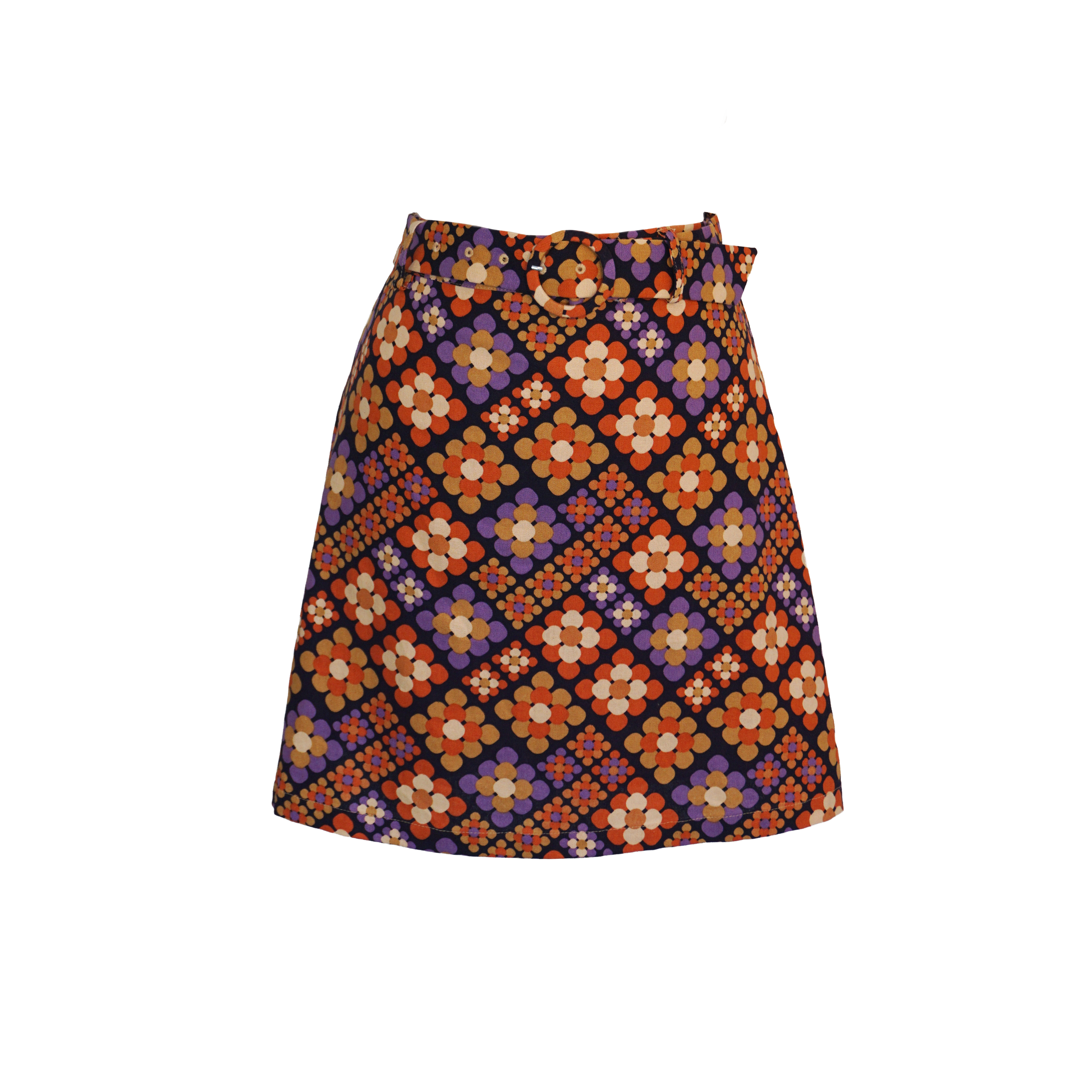 We love this Retro printed Autumn A line skirt! With orange, lavender and deep purple, this lined skirt comes with a belt and just happens to match many of our sweaters, The 60's vibe provides a playful look that works at work or play. Made of a cotton linen blend.