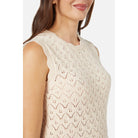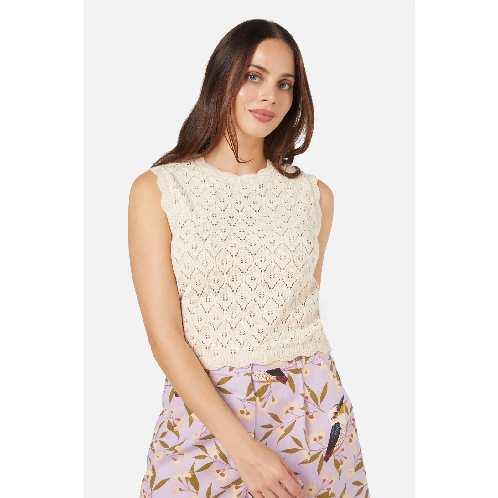 We love this crop sweater in a cream diamond pointelle. This sweet knit top features a round neckline and scalloped details. 100% cotton. Looks great under one of our jumpsuits and with the Native skirt!
