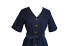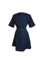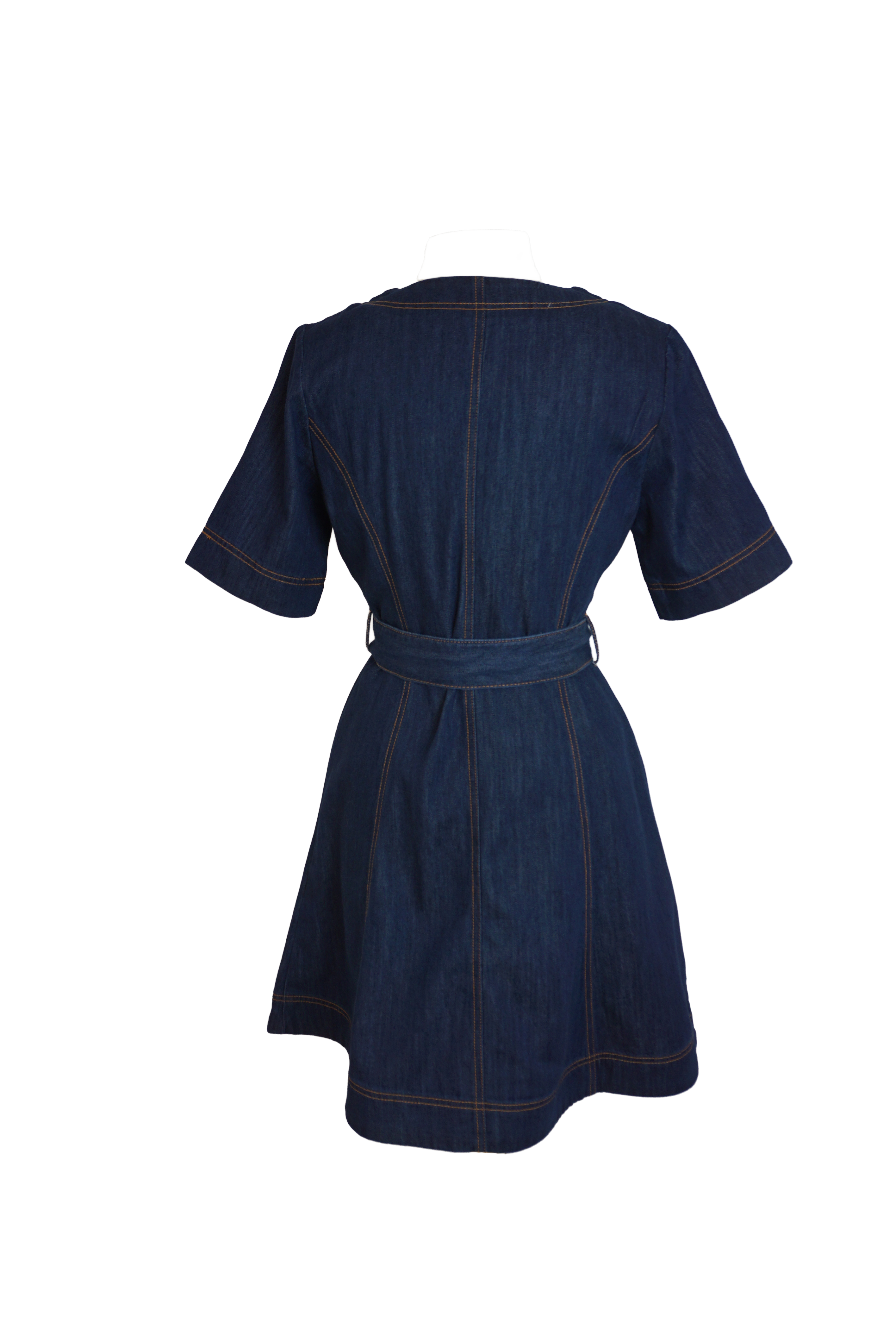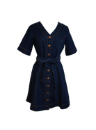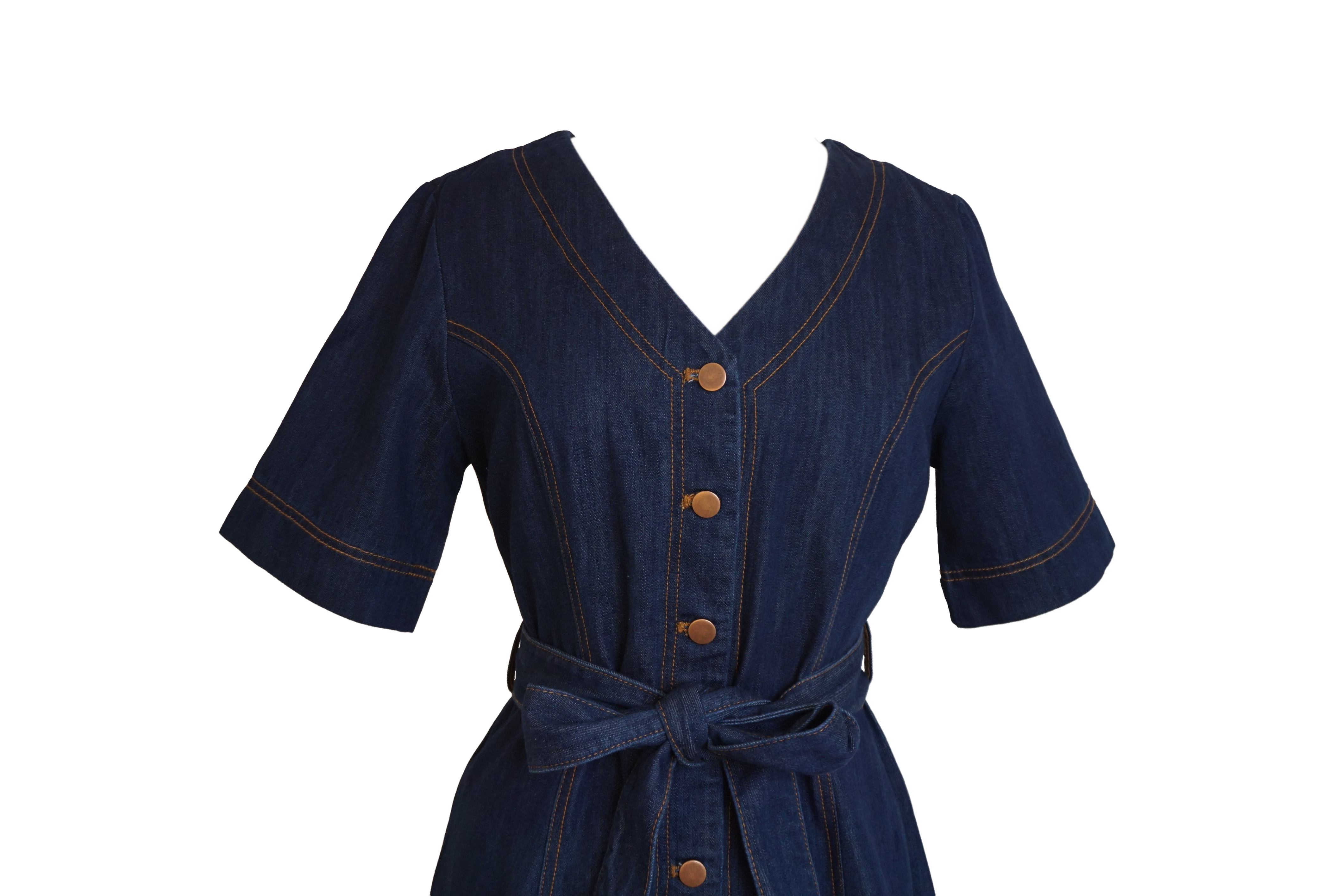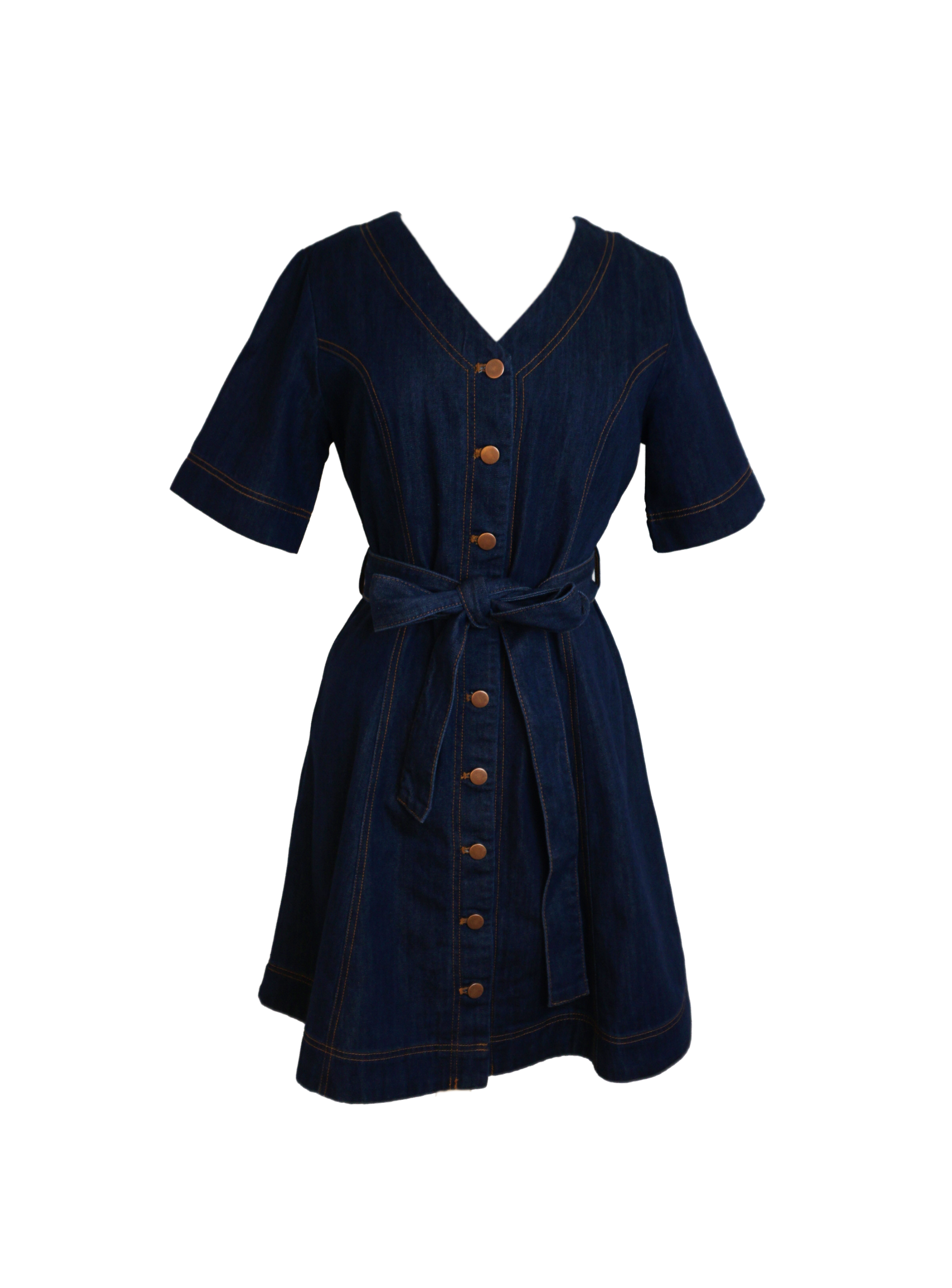 The Tegan short sleeve denim mini dress is the perfect layering piece to have on hand as the seasons shift. Features a short sleeve style with a button through front, flared skirt & tan stitching for a cool casual look. Made of a lightweight dark denim cotton with a matching waist tie. We love this dress paired with tights, boots and a big chunky sweater :)