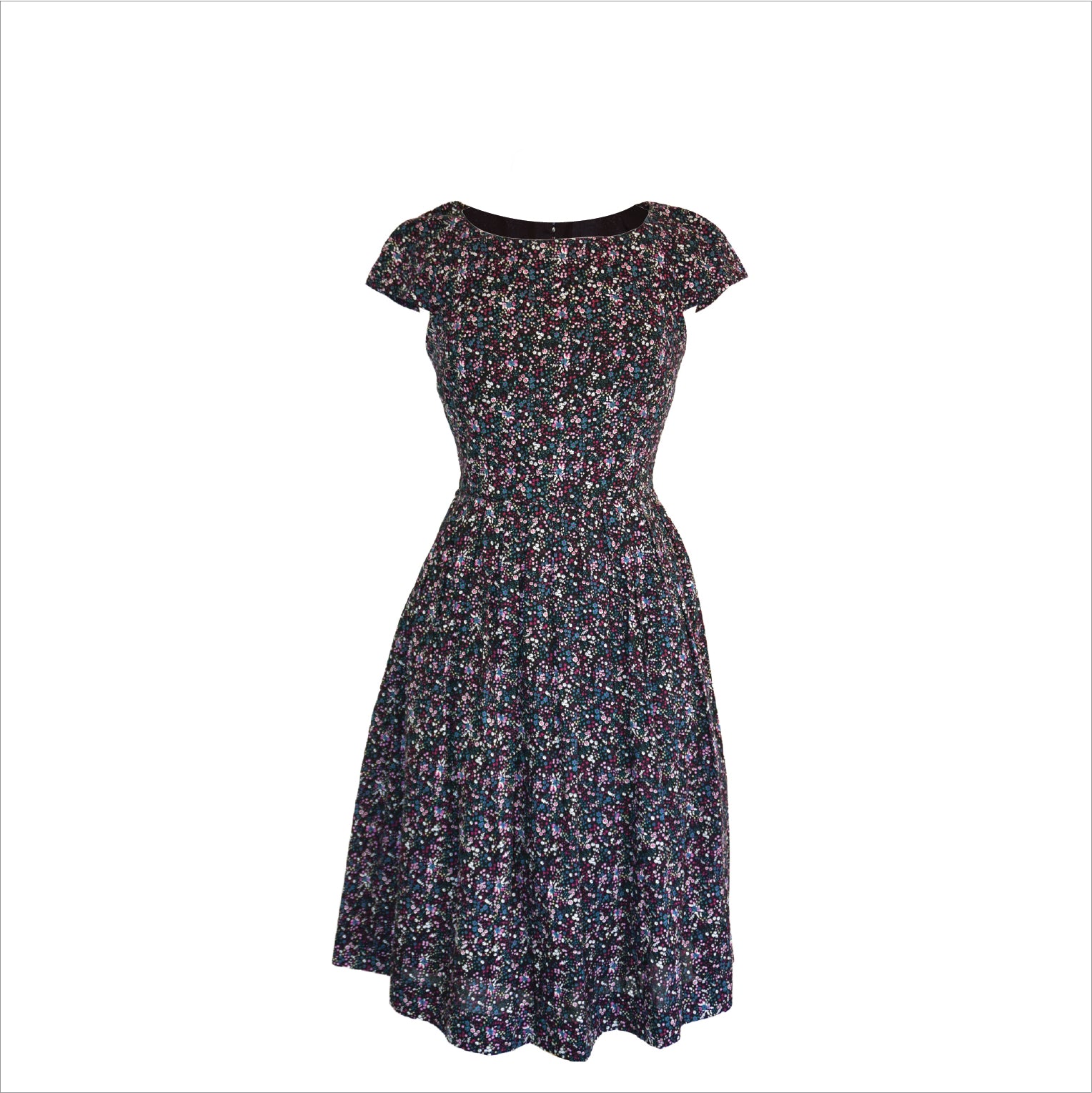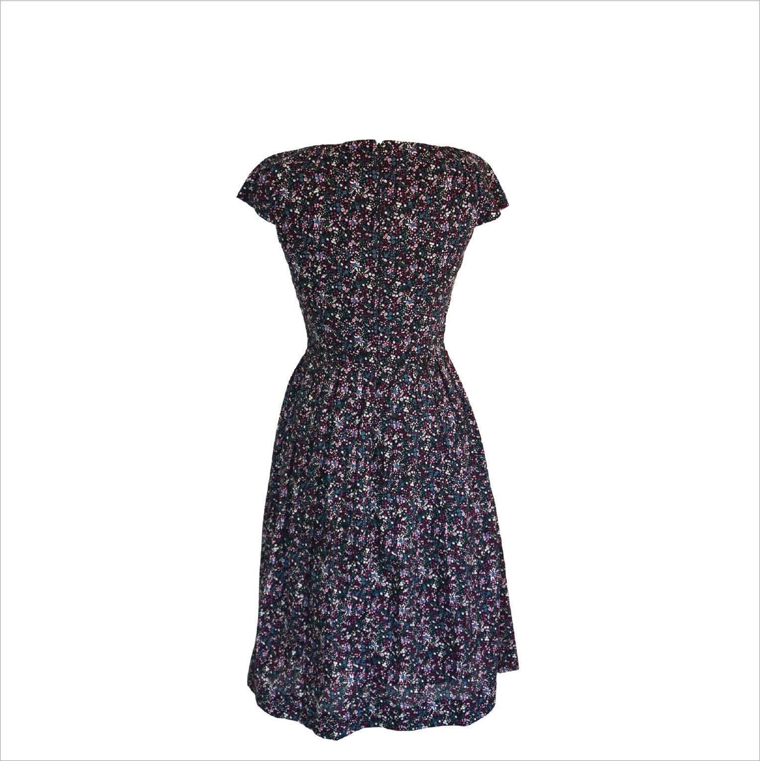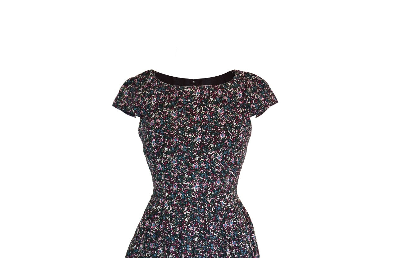 This beautiful dress with a floral print in blue and burgundy shades. Perfect for autumn with tights and a cardigan. The dress is really well constructed with a fitted bodice that zips at the back and a full skirt with pleats and side pockets. The entire dress is lined with a thin cotton lining, which gives it a nice weight.