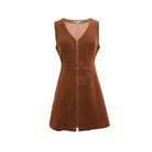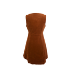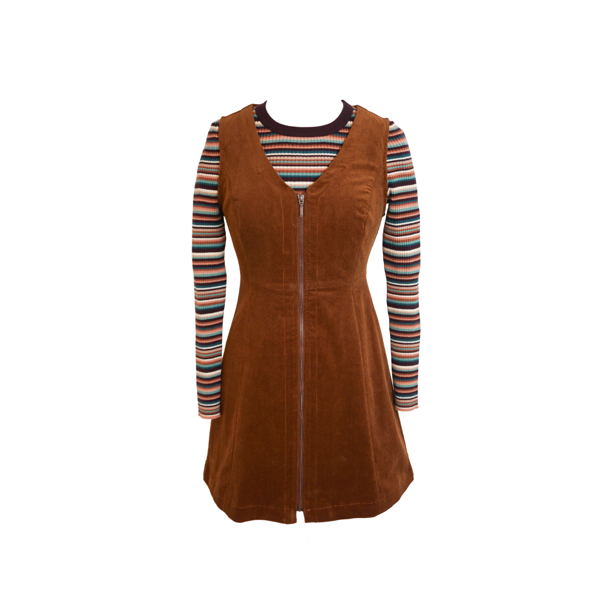 We love the Prep School vibe of this cord pinafore! The front full length zipper gives that edginess that will make this one of your Autumn favorites! The V neck, semi fitted bodice and flare skirt will show you off in all the right ways while also be the ultimate layering staple! Made of a toffee-colored elastane blend corduroy.