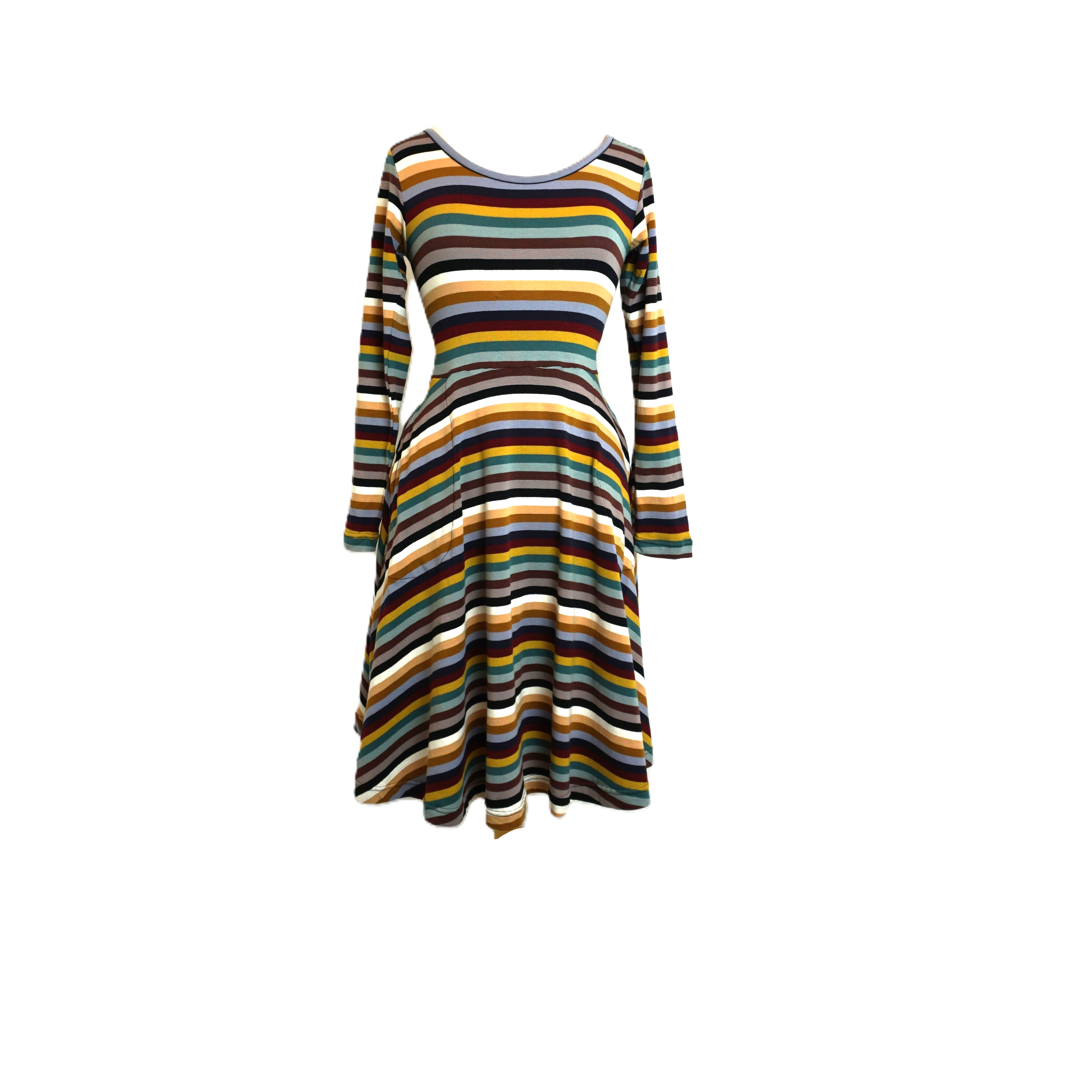 This soft jersey dress features the perfect colors of Autumn! With radiant stripes, it adds  fresh energy in the midst of the graying weather outside. Adorable with trainers, flats, boots, tights . . . . it is the perfect Fall staple! Adorable with our jean jackets or the Deauville Shrug in Rust.
