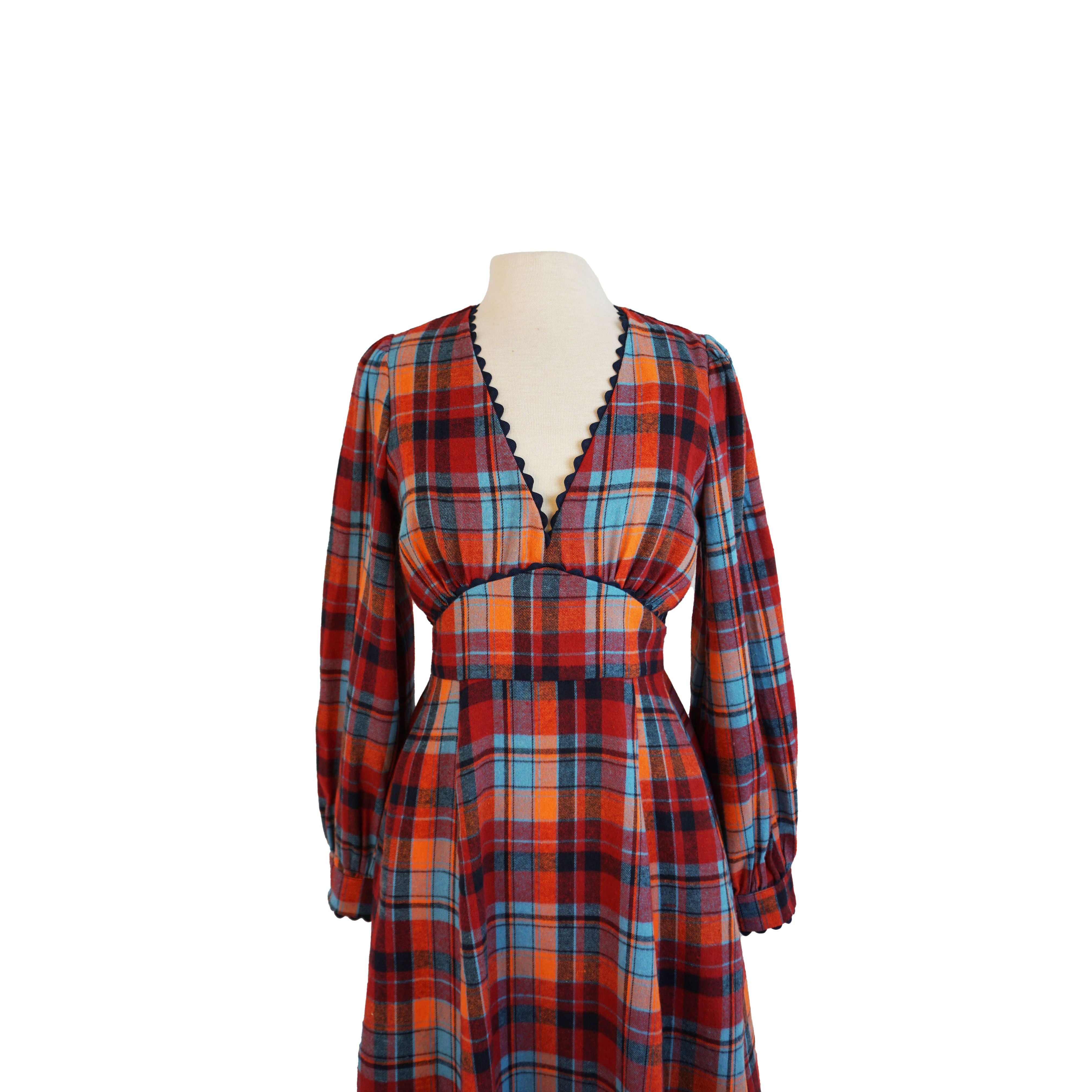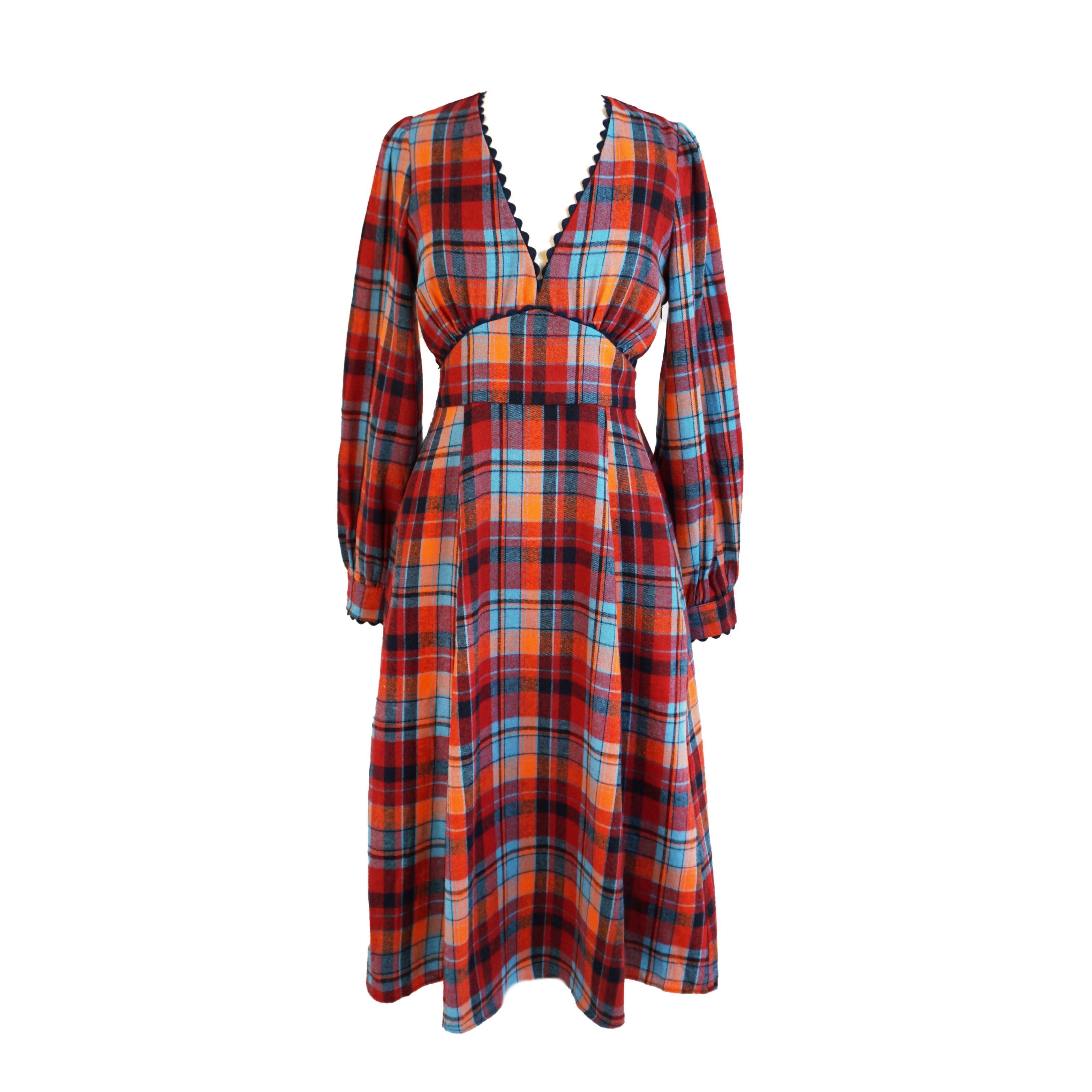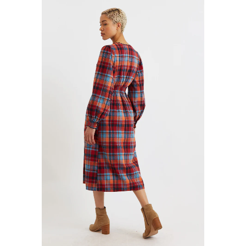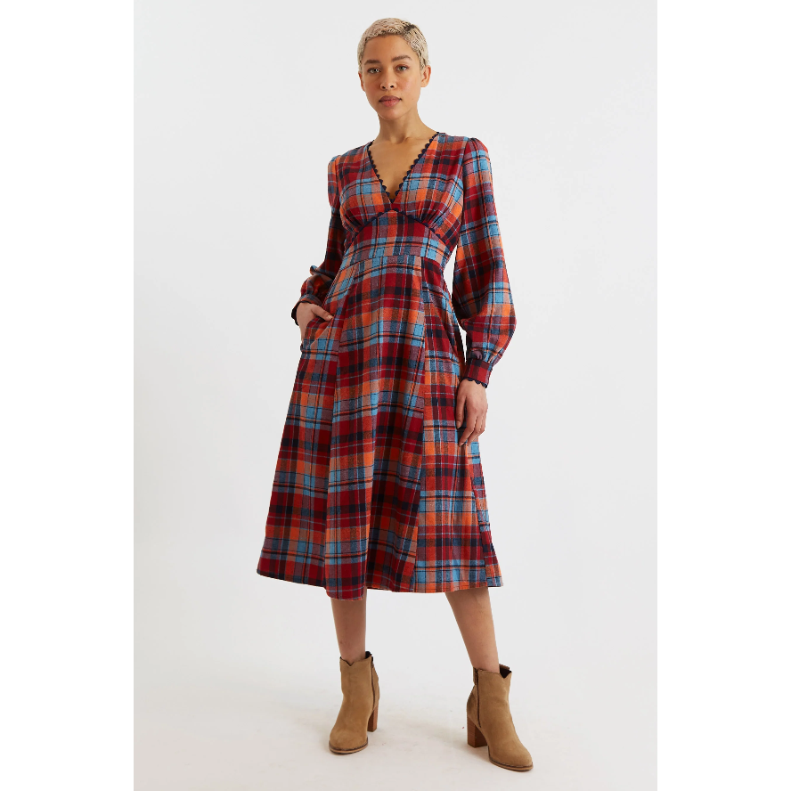 Look stylish and autumn ready in the Marize Tartan long sleeve midi dress. Crafted from a soft warm brushed check with navy, turquoise, red, and apricot hues, the V-neckline features a Ric rac trim for extra detail. Featuring wide billowing sleeves, an elasticated back waist for ease and definition, and deep pockets.