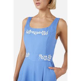 We are in love with this gorgeous blue viscose/linen blend jumpsuit! From casual days to formal events, this piece can easily be dressed up or down. The scooped neckline and wide waistband wide are embroidered with a sweet cream retro floral design against the periwinkle fabric. Full length wide cut leg gives great movement.