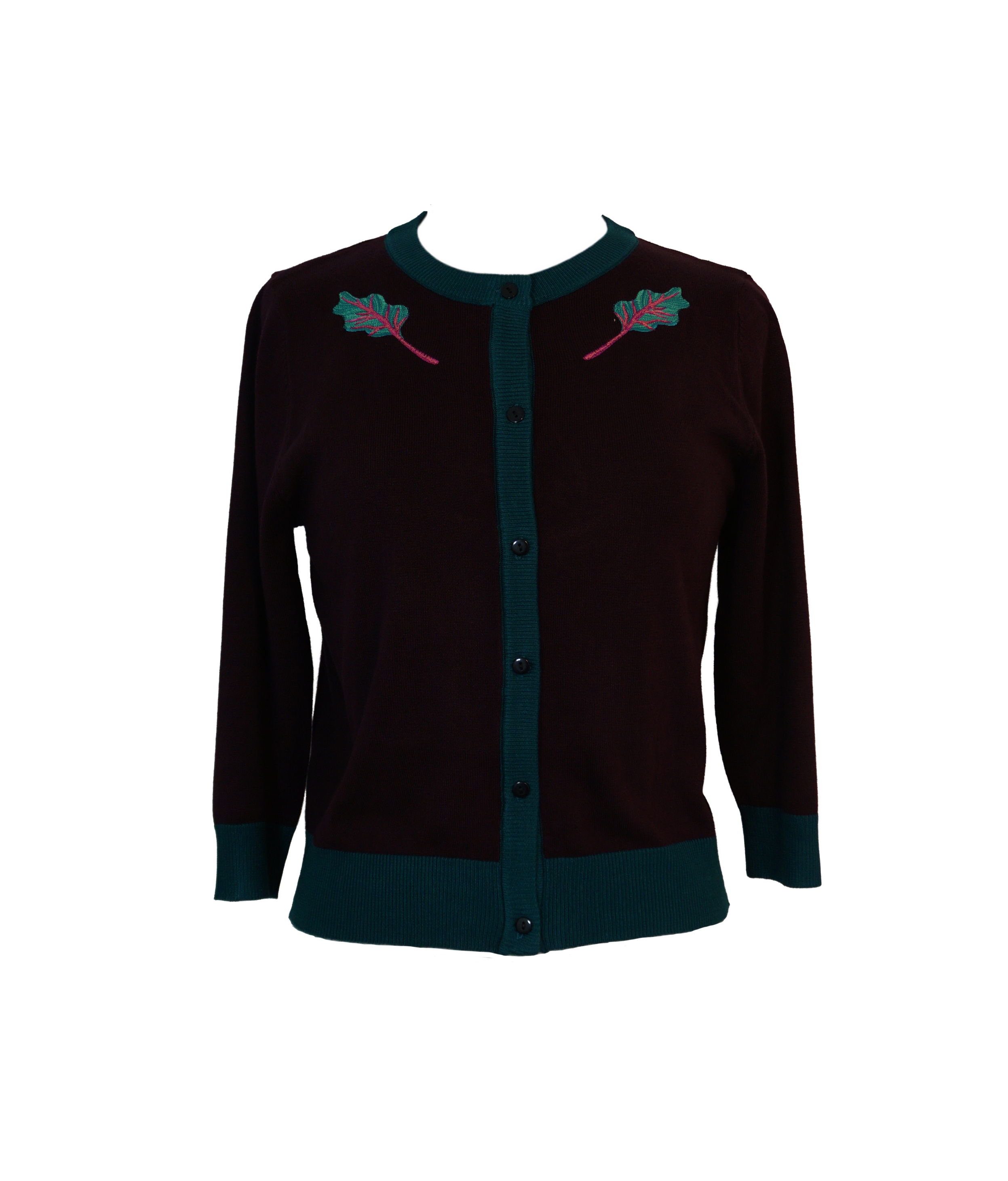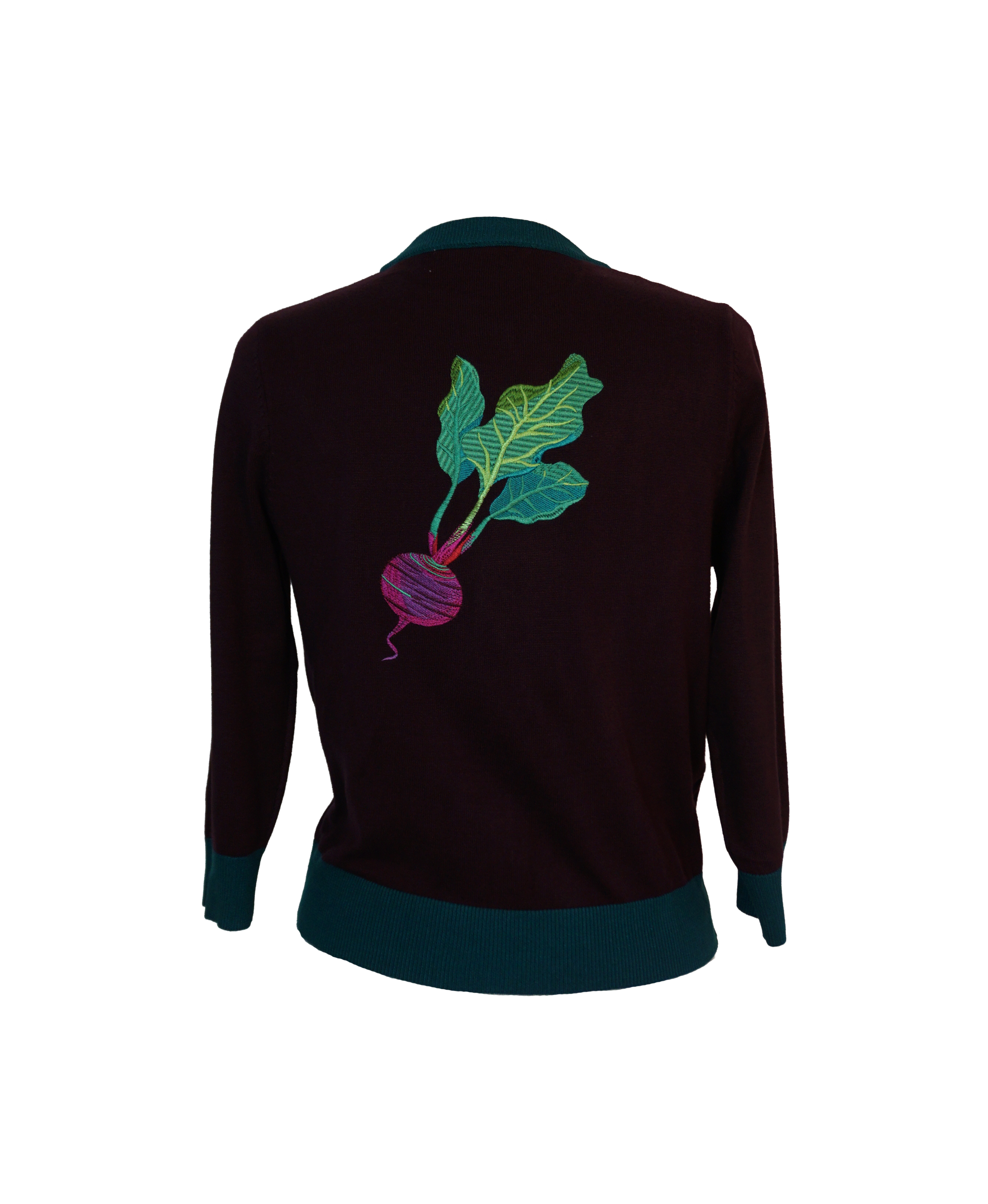 We love these colorful embroidered cardigans that are perfect for Fall! Made of a viscose/poly blend, the soft fabric has terrific stretch. The 3/4 sleeves makes it perfect for Fall and Winter layering. This one features an original design of - yes, a beet. A leafy beet is indeed the muse. Mix and match with one of our Fall outfits, throw over a tee with jeans or pair with a favorite skirt. Either way, you'll find yourself in a more playful mood :)