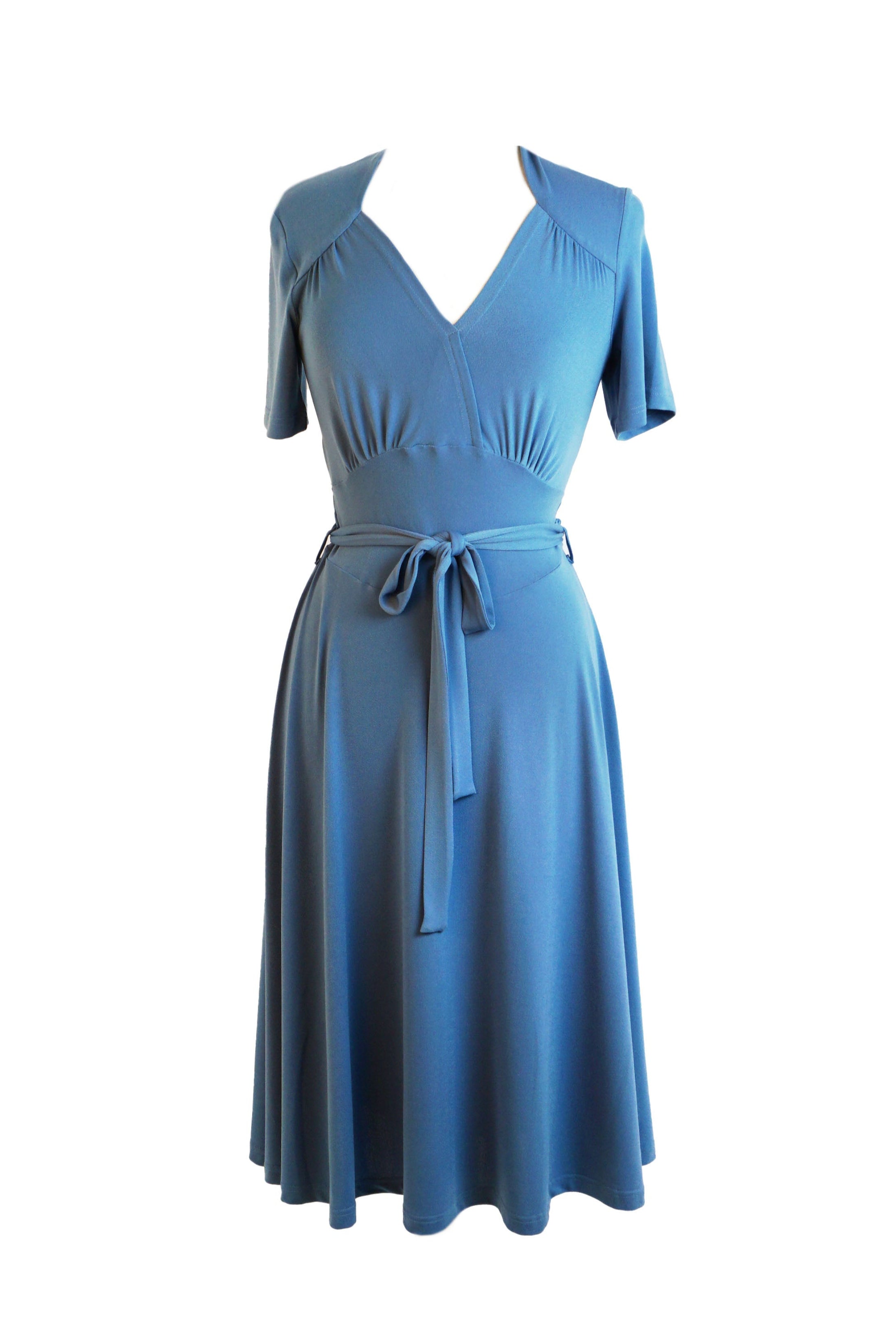 This gorgeous airy blue dress is full of old Hollywood charm! The stunning sweetheart neckline and flared skirt will have you feeling like a movie star, but the light polyester fabric with a slight stretch will keep you comfortable all day long.