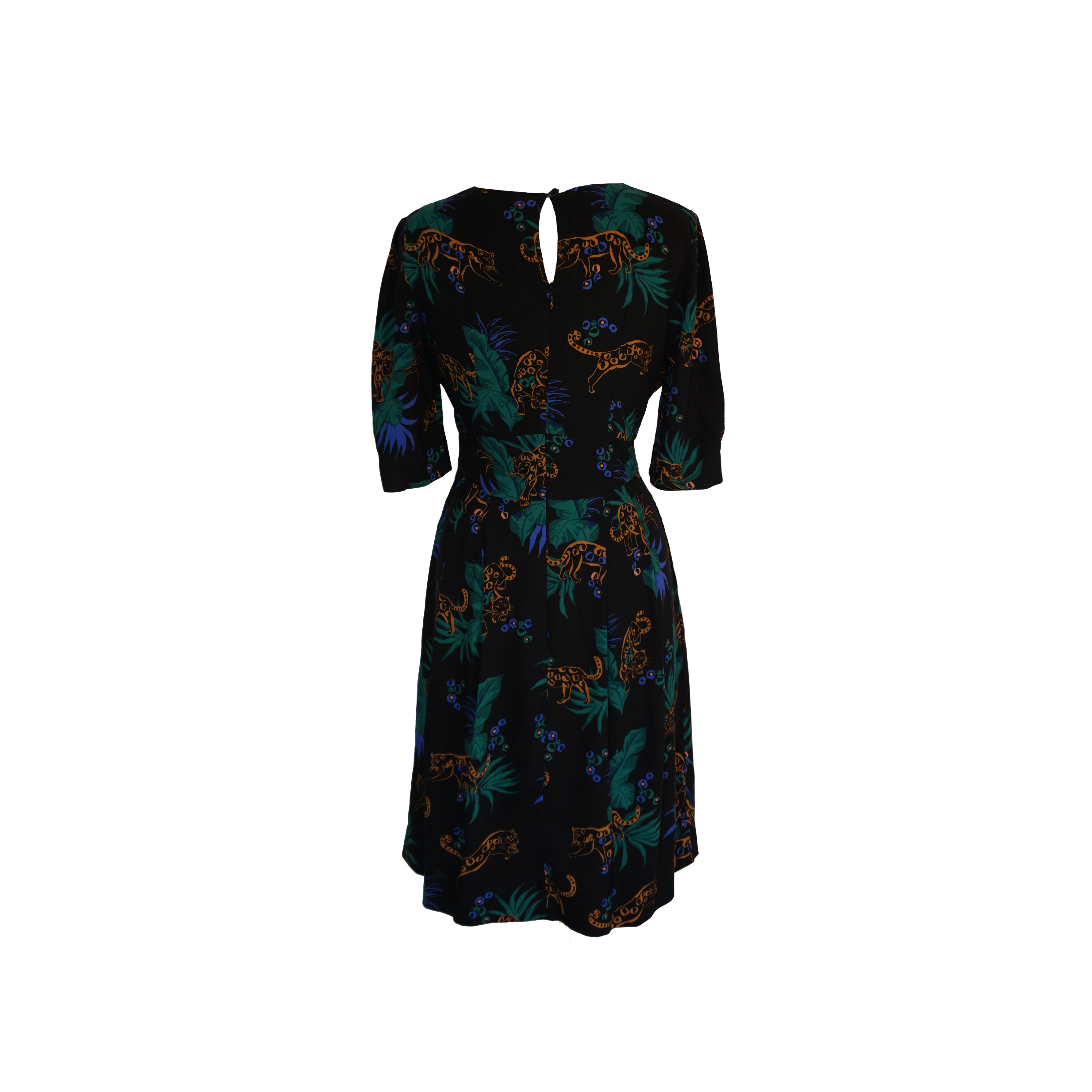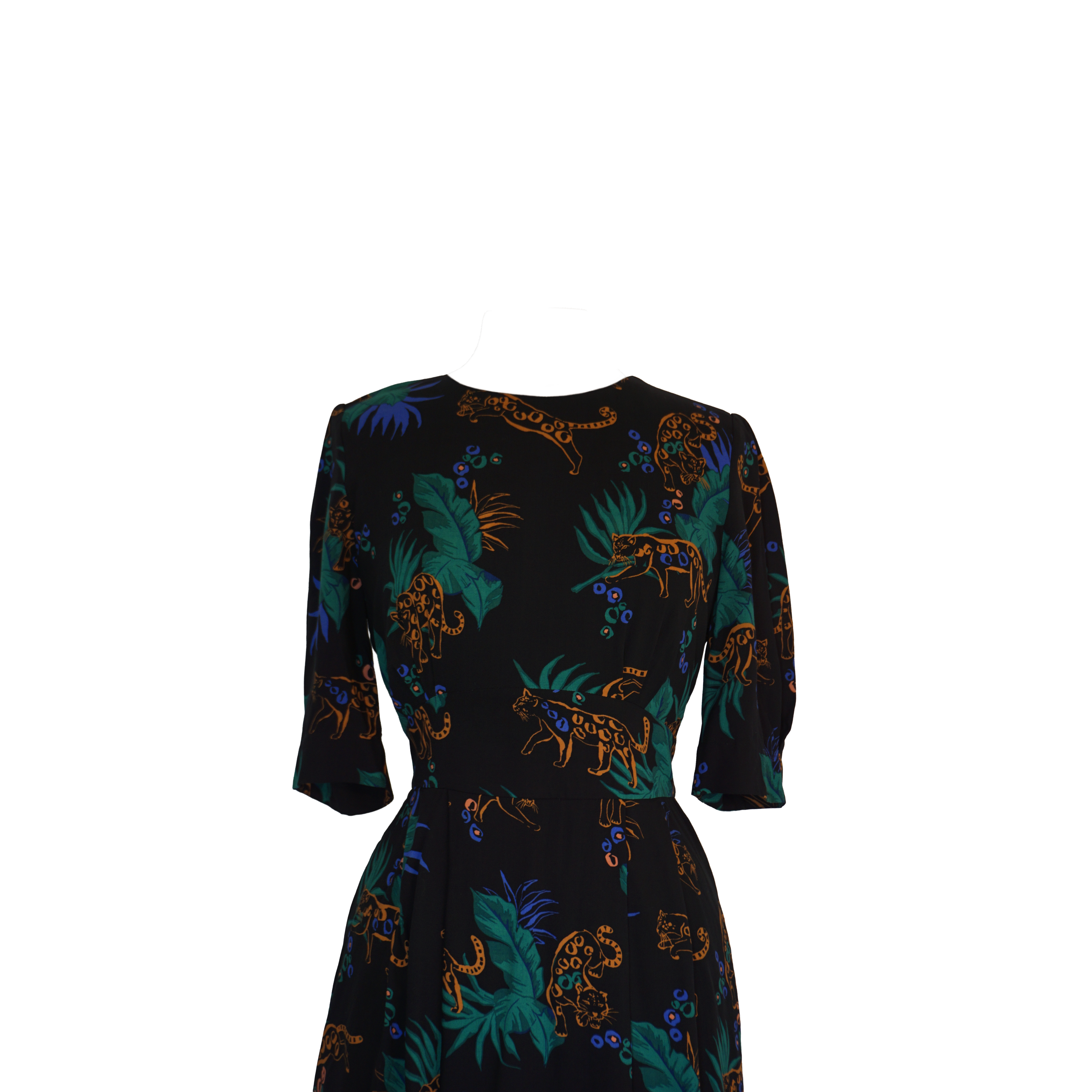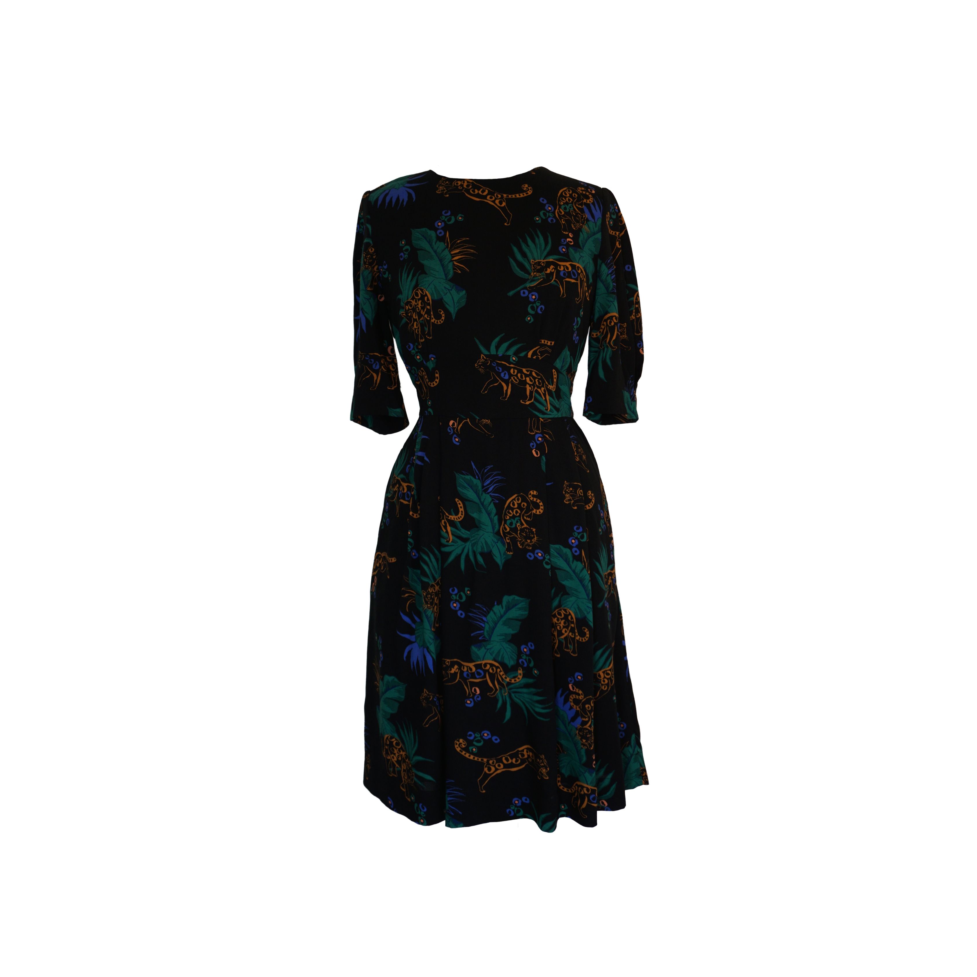 The perfect autumn/winter, day to evening dress! Choose our Midnight Leopard print to turn heads wherever you go. Featuring a wide waistband and bust and skirt pleats to create an elegant, flattering fit, we’ve also added inverted box pleats at the cuffs to give volume to the half length sleeve. A center back keyhole and button detail add interest. Fully lined with an invisible side zip to close and finished with our signature concealed side seam pockets.