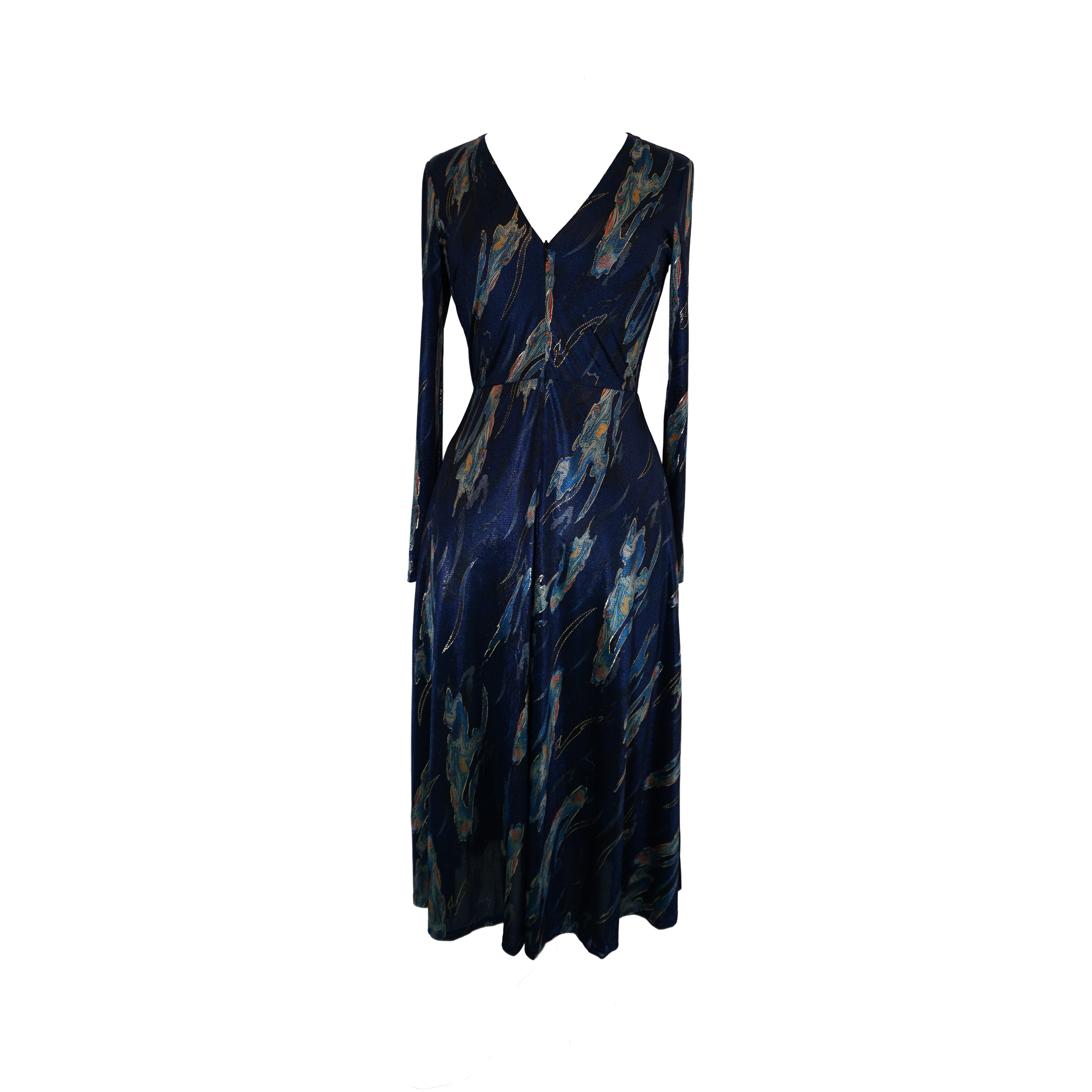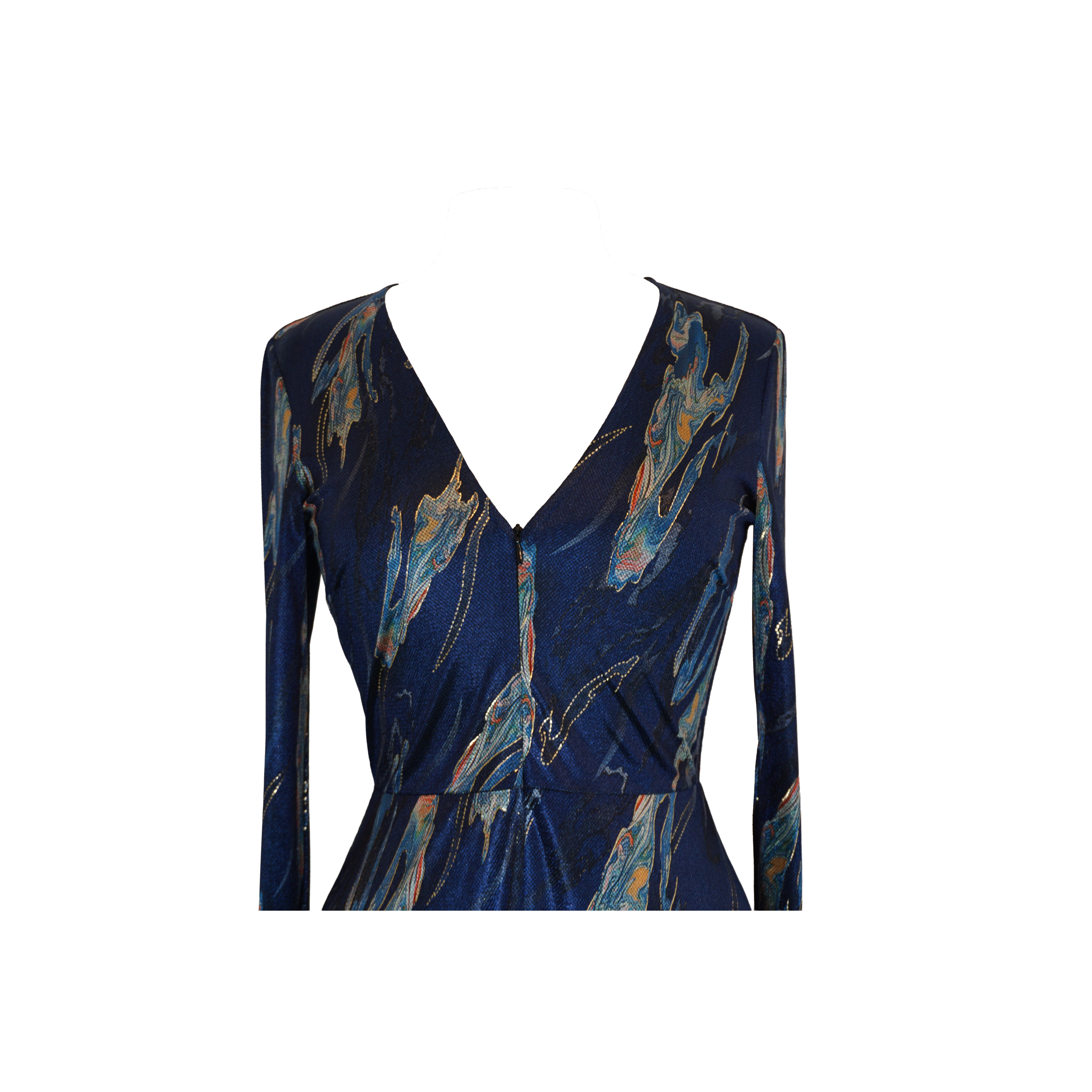 Get party season ready in this gorgeous Zelda midi dress, featuring long fitted sleeves and a V-Neck with a front zip. The Badlands and Blues fabric is as soft as it is gorgeous, in a stunning shade of royal blue with metallic print. Team with some heels or boots and you're good to go. Unlined.