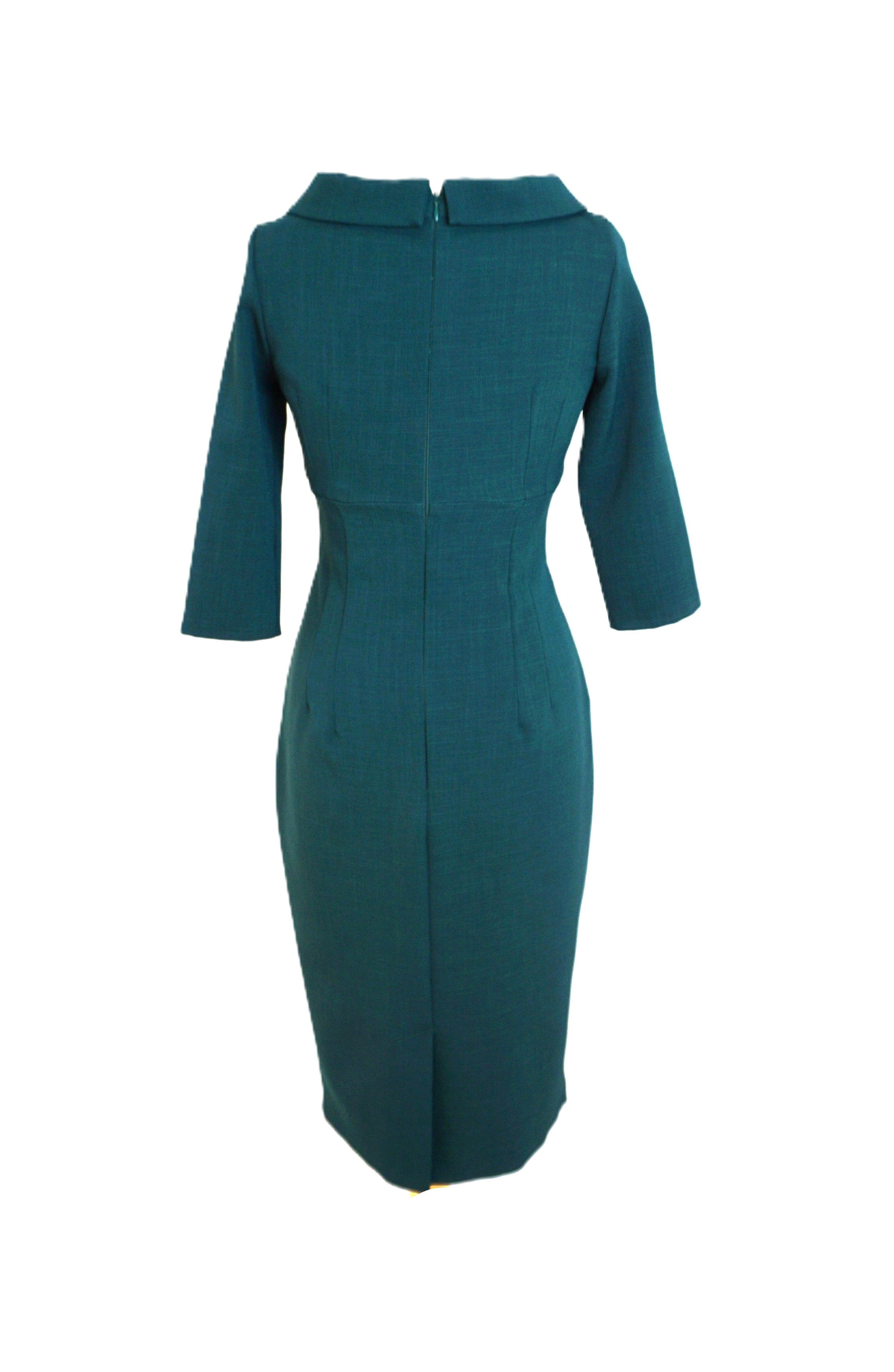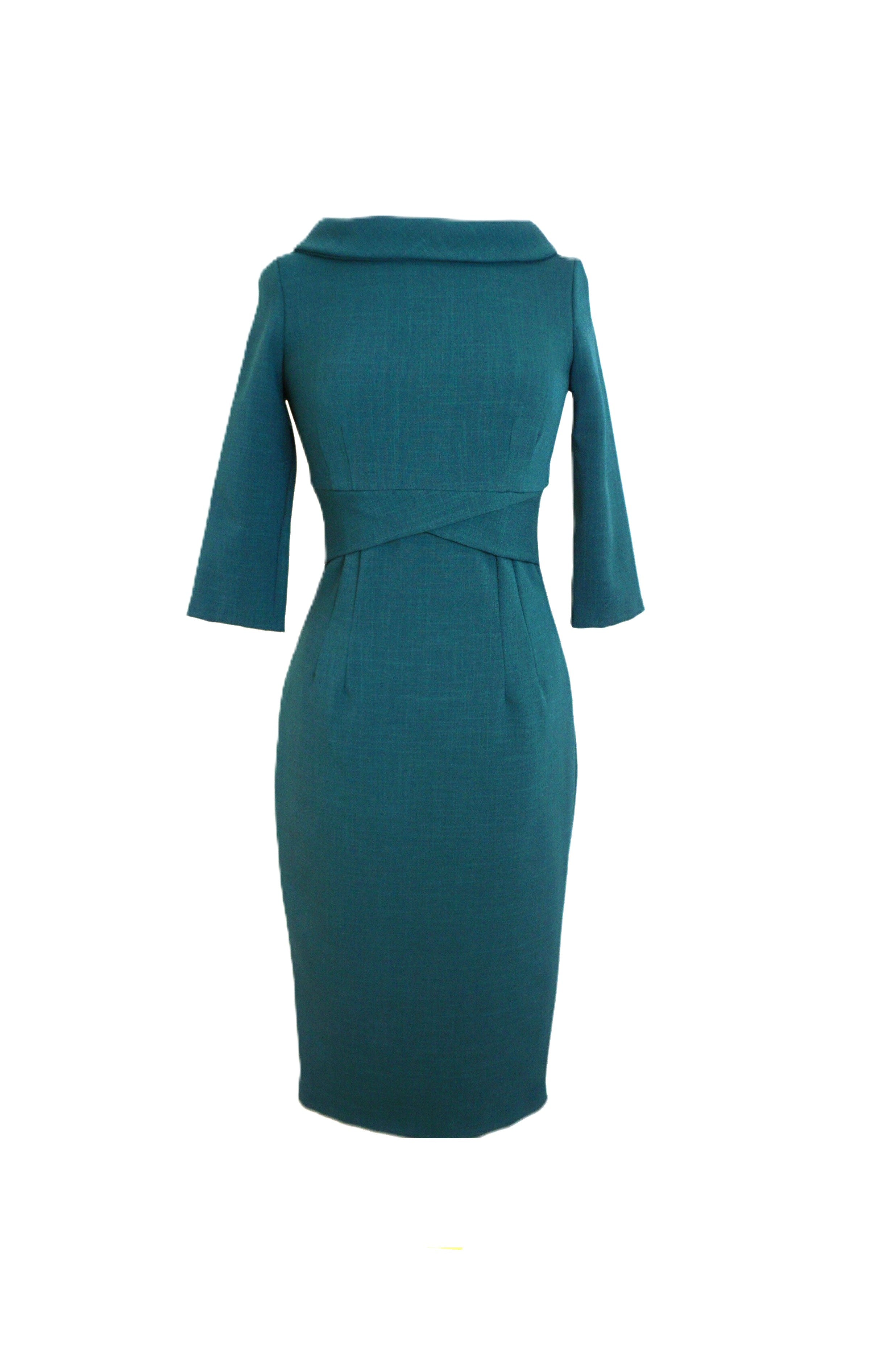 Step into classic charm with the Kennedy Pencil Dress in Forest Green. Crafted from stretch luxe crepe, this dress features a chic roll collar, tailored pencil skirt with a stylish vent, and sleeves that hit just below the elbow. The cross pleat waist detail and concealed back zip add polished touches, while the stretch control lining keeps you comfortable and confident. Add a statement brooch and sleek heels or block heels to complete your playful, elegant look.