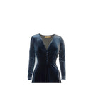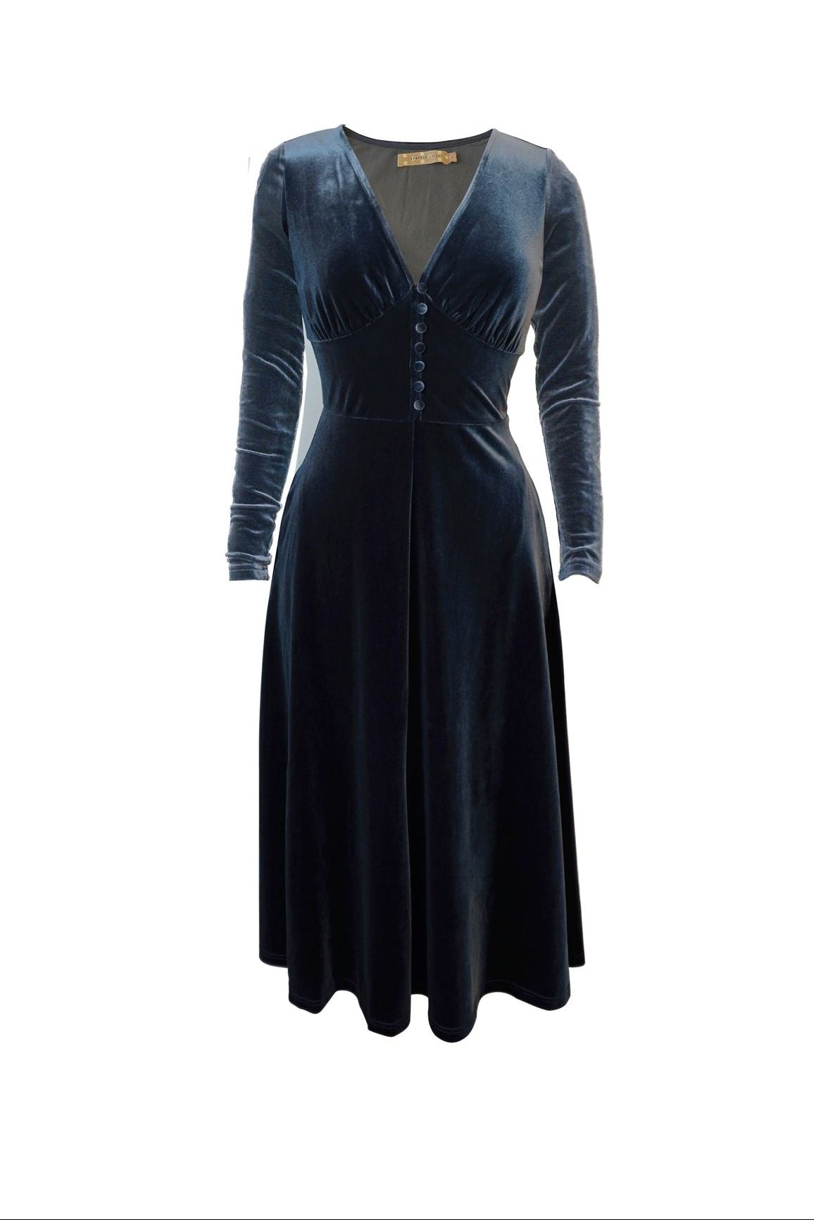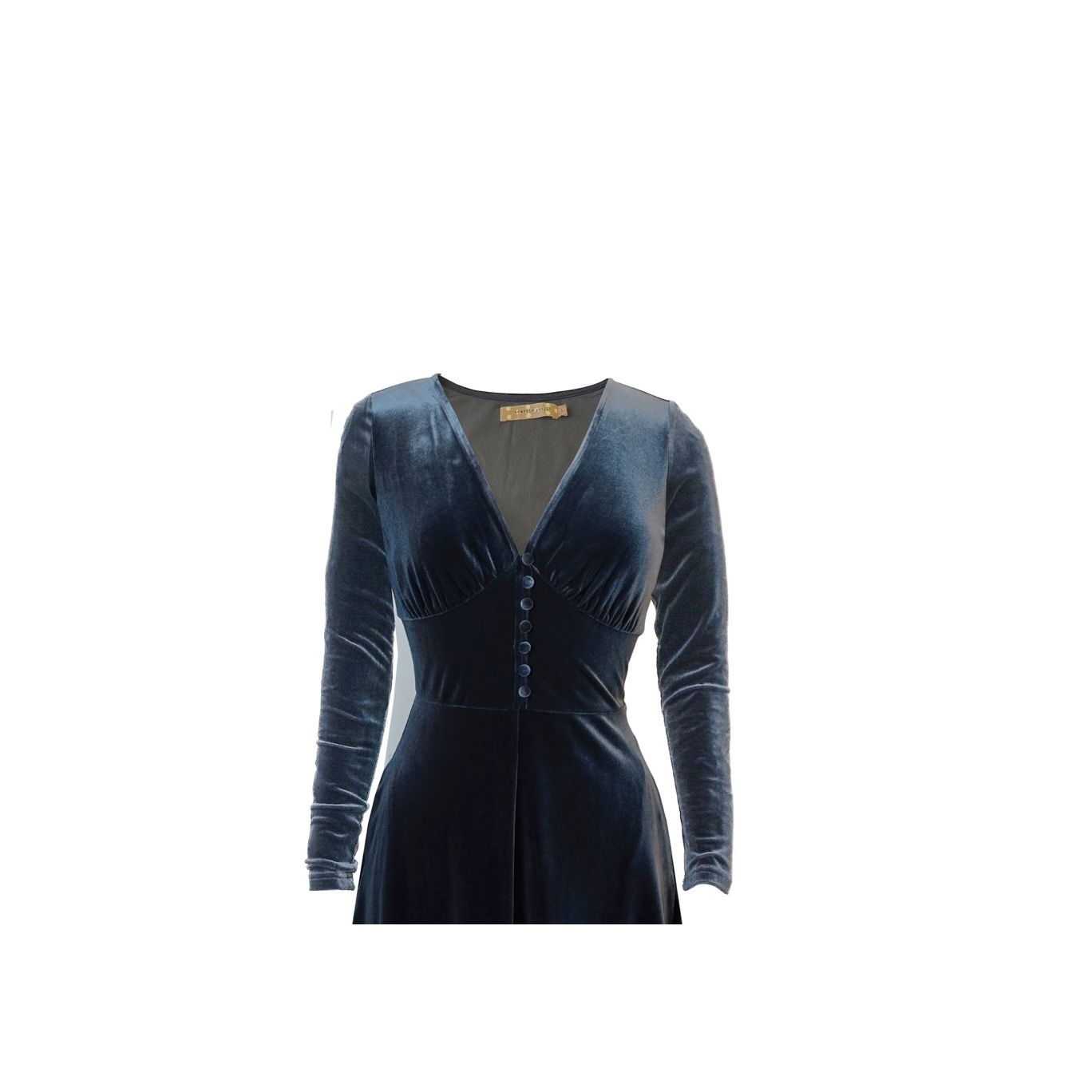 The Velvet Smoke Midi Dress is perfect for the winter season. With long narrow sleeves, a V-neckline with small gatherings under the bust, and fabric covered buttons on the bodice. We're sure you'll be reaching for this dress all season. In a stunning dark blue velvety fabric.