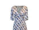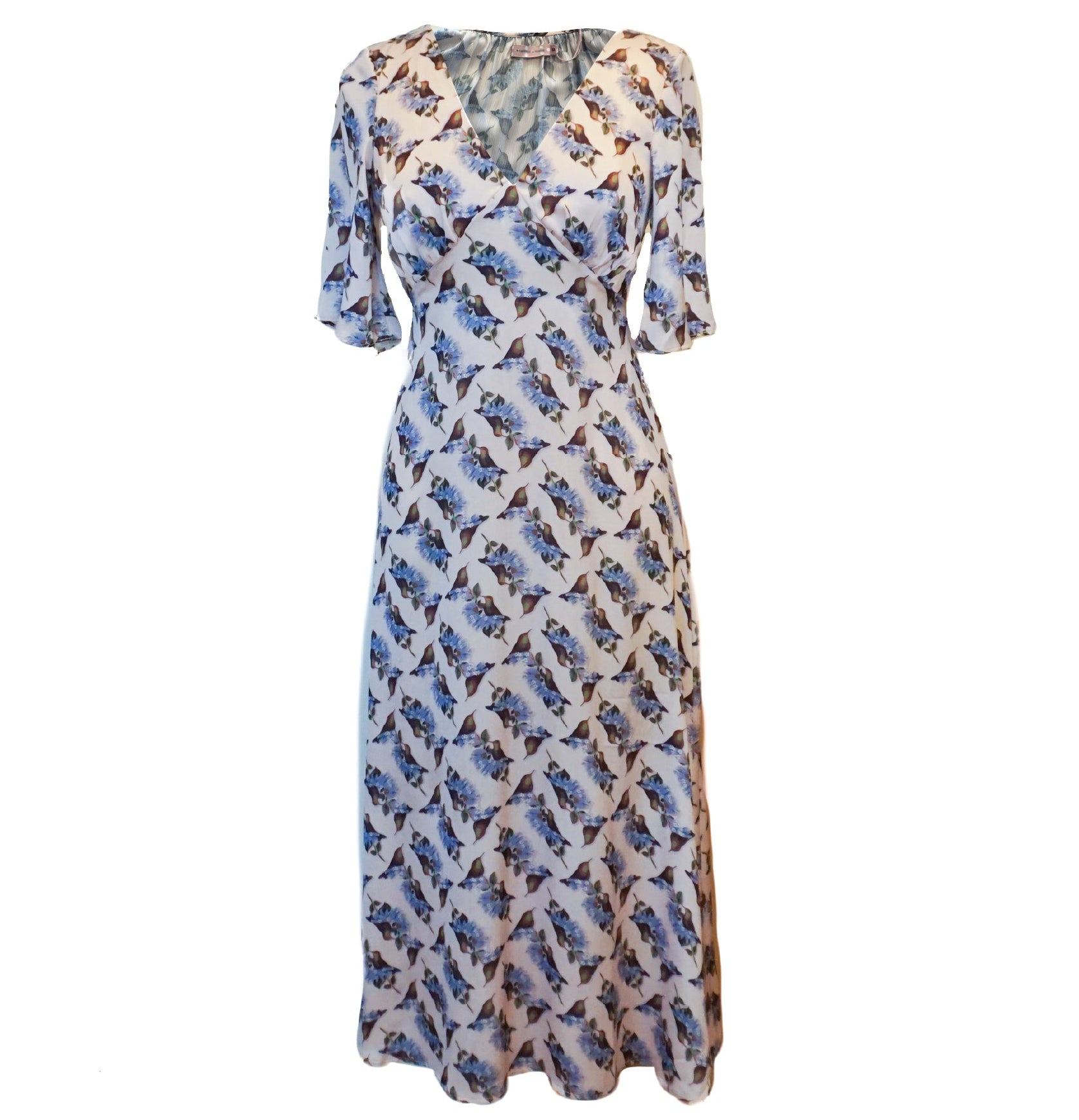The Blithe Dress looks stunning in this white and blue bird floral print, which brings the perfect touch of Spring. A gorgeous deep V-neck midi dress, with buttery soft fabric and flattering gathering on the bust and mid length trumpet sleeves which floats beautifully in the breeze. Fastened with a back zip. A perfectly versatile outfit which can be dressed up or down to suit any occasion!!