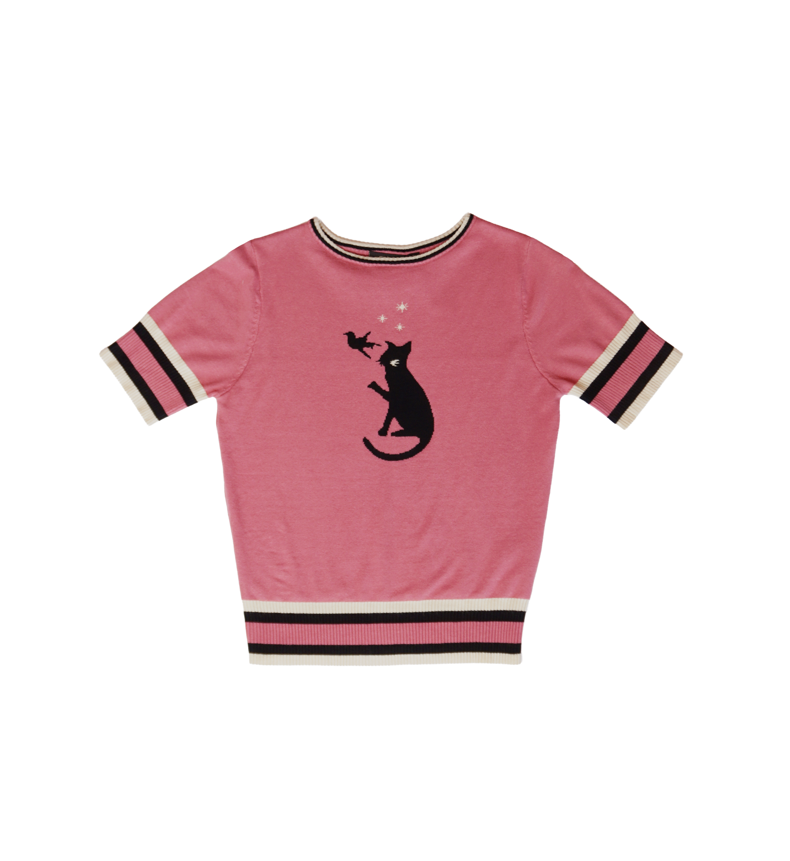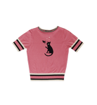 This darling short sleeved kitty sweater is the perfect solution to your early Fall wardrobe! The striped sleeves add a sporty feel to this fun sweater. Made of 100% viscose and needs to be hand washed.