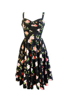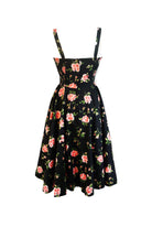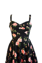 Step back in time with the Sandi Beauty Queen Dress, a playful 1950s-inspired sundress featuring a fitted bodice and a full skirt that twirls with every step. The black fabric adorned with charming pink roses adds a sweet, vintage flair, while the elastic ruching and back zipper ensure a comfortable, flattering fit. Perfect for sunny days and fun outings, this dress combines quality craftsmanship with a cute, lively style that’s sure to brighten your wardrobe.