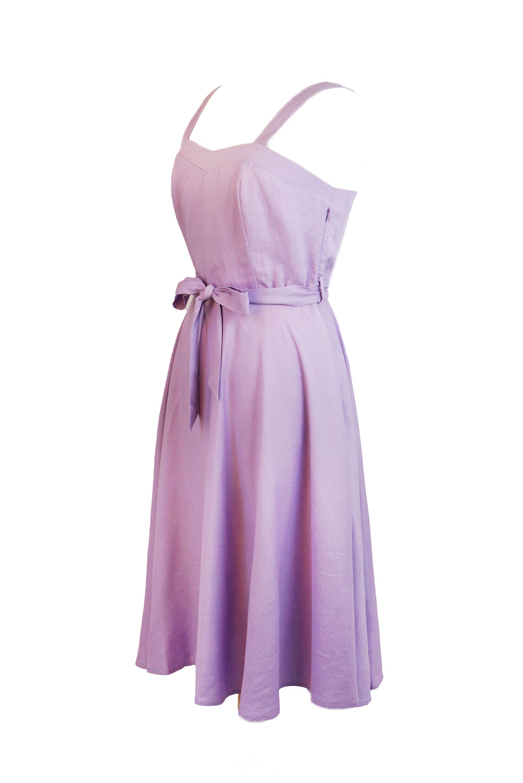 This charming Miss Lavender Dress is crafted from a breezy blend of 70% viscose and 30% linen, perfect for warm days. It features handy pockets, a flirty sweetheart neckline, and adjustable straps for a custom fit. The flared silhouette and removable sash add a playful touch, while the concealed YKK zipper keeps things sleek. Easy to care for—just machine wash in cold water and hang to dry!