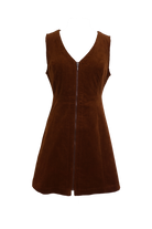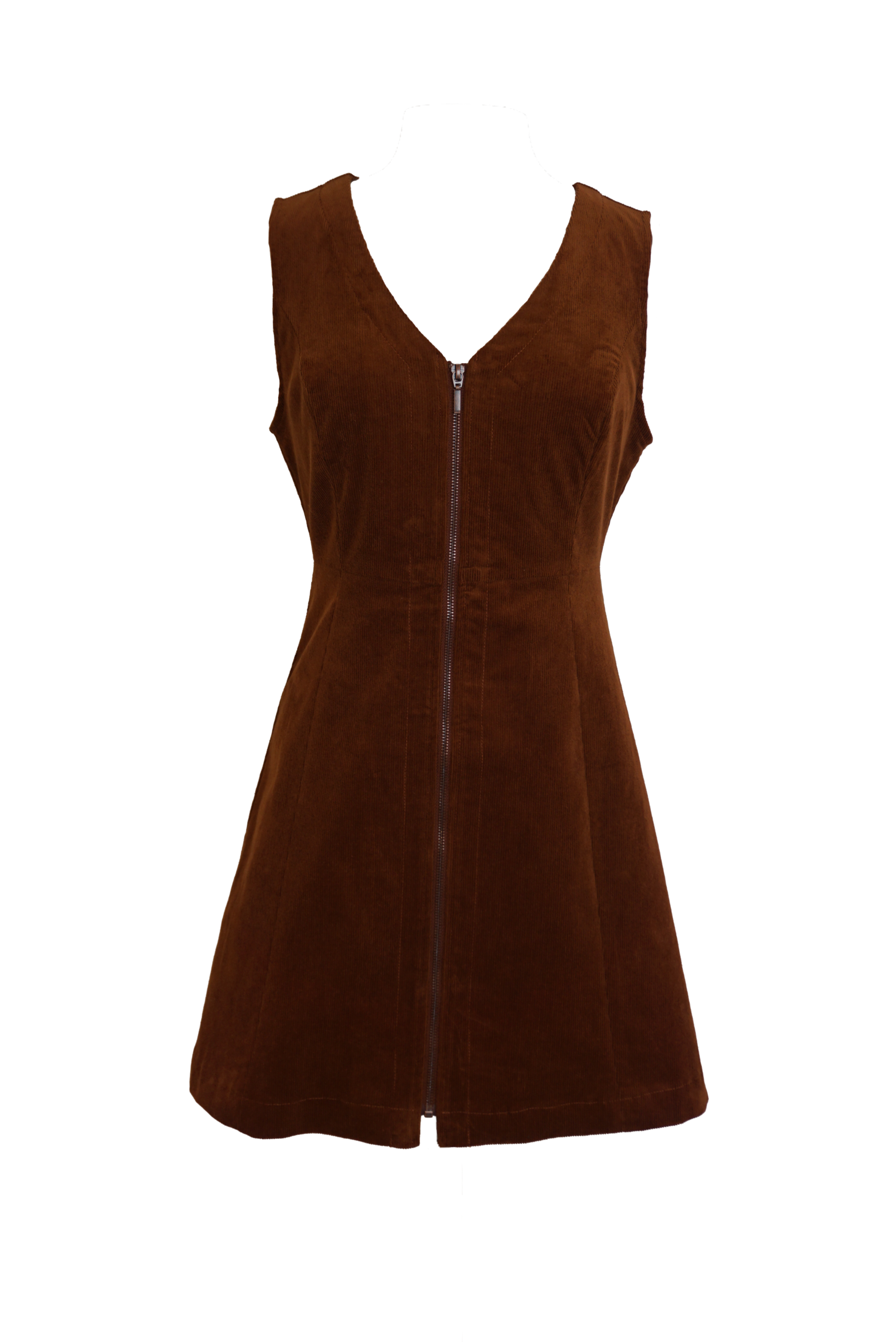 We love the Prep School vibe of this cord pinafore! The front full length zipper gives that edginess that will make this one of your Autumn favorites! The V neck, semi fitted bodice and flare skirt will show you off in all the right ways while also be the ultimate layering staple! Made of a toffee-colored elastane blend corduroy.