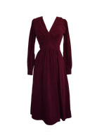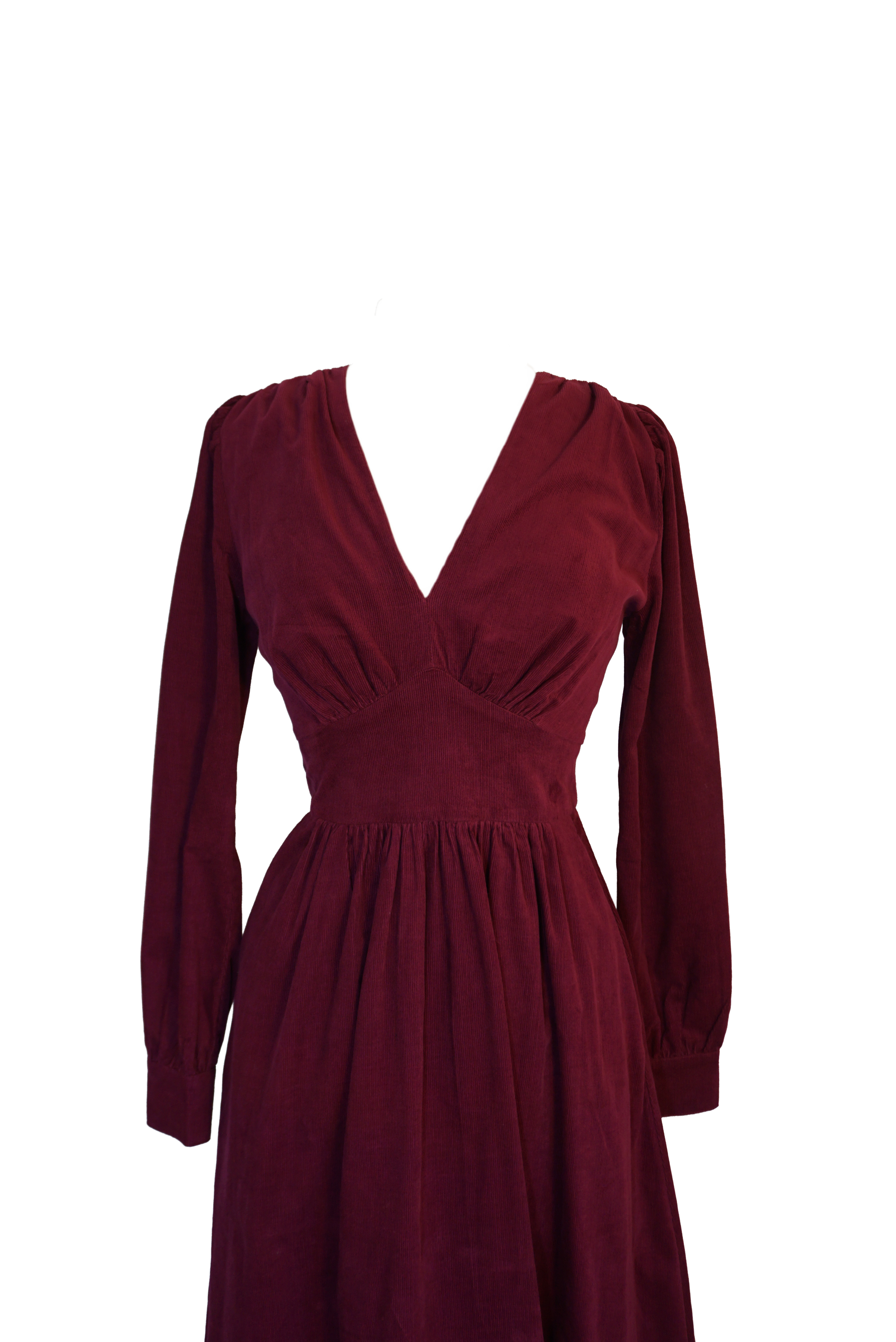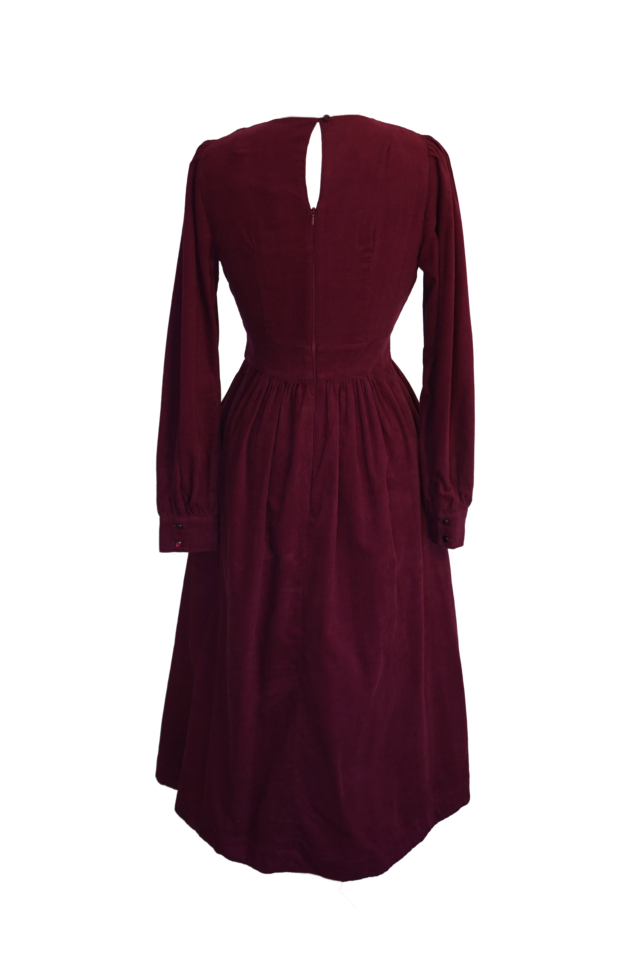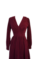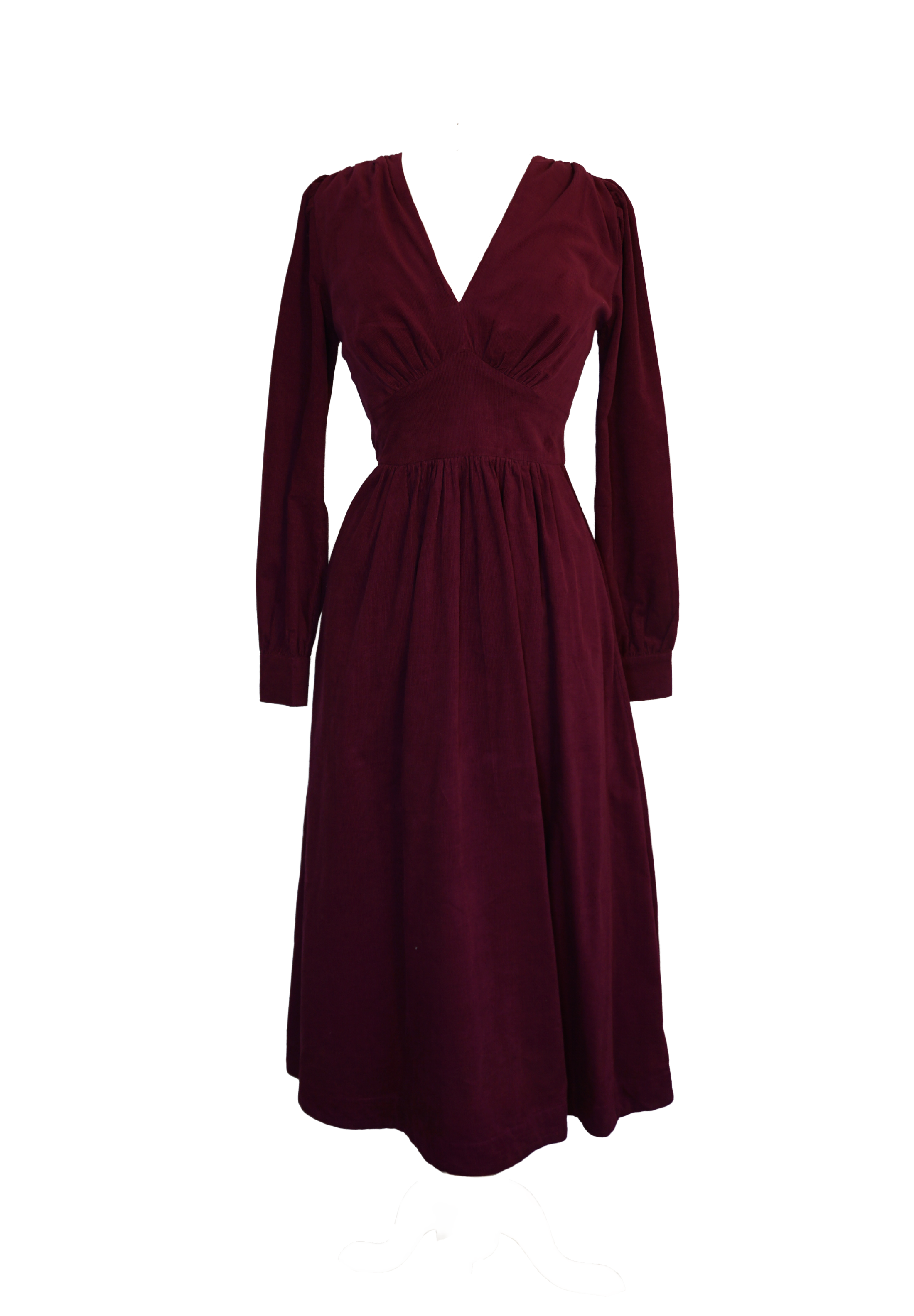The Amara Dress is a new Emily and Fin hero dress. With a deep v-neckline over a fitted waistband for a feminine and flattering fit, and ¾ length sleeves gathered into buttoned cuffs finishing just below the elbow. The midi length skirt is gently gathered front and back for soft volume, and features deep inserted side pockets. The Amara Dress is fully lined and opens with a concealed zip at the back, and finishes with a small button over an elegant keyhole opening.