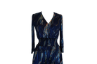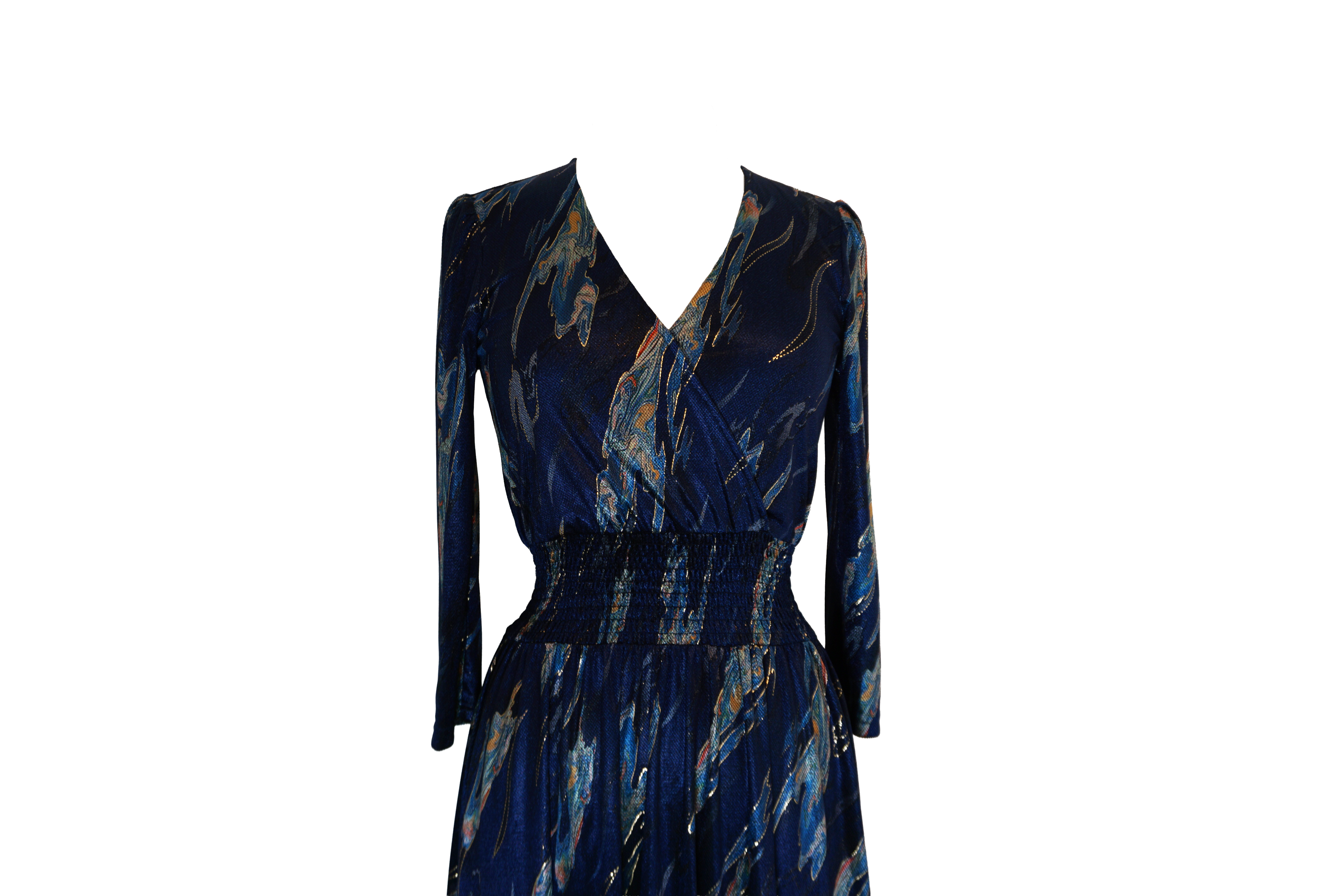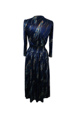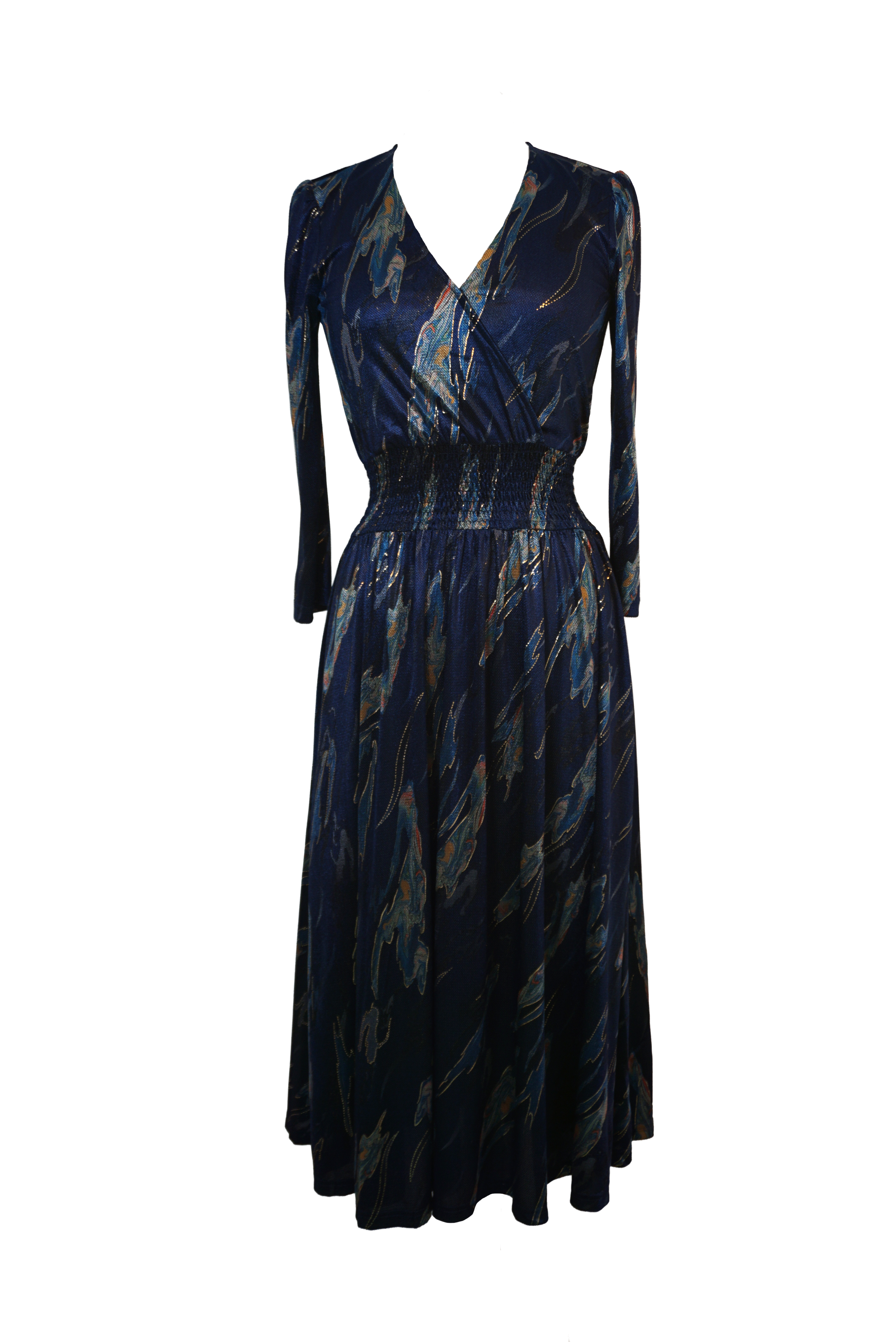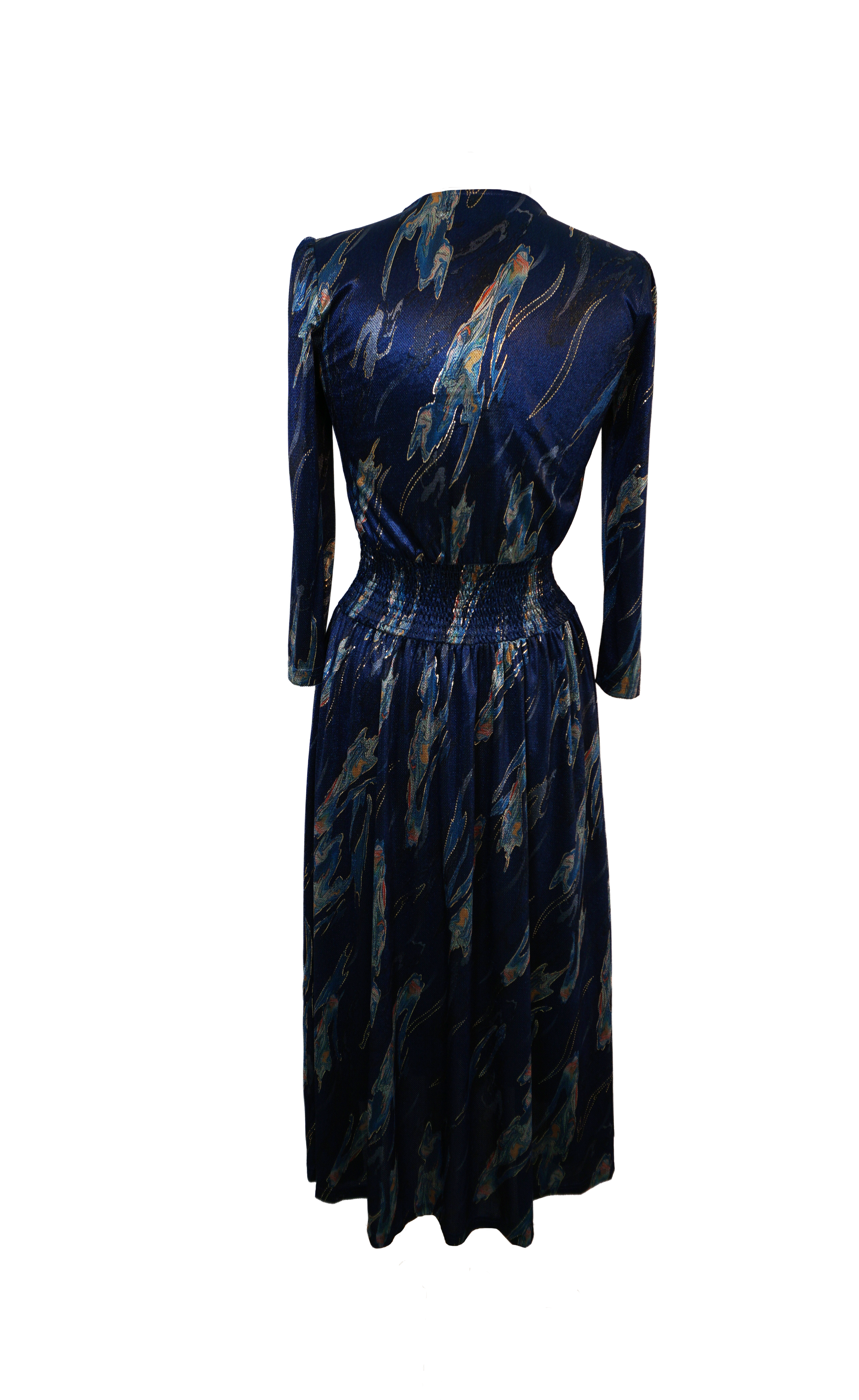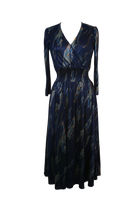 The Badlands and Blues dress is fabulous in this bold blue print, with hints of metallic. Featuring long 3/4 length sleeves and a flattering smock waist that makes it all the more comfortable. The perfect midi length party dress. Unlined.