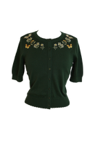 This short sleeve dark green cotton cardigan, embroidered with sunny yellow butterflies & flowers, is the perfect transition piece into Fall. Scalloped edges on the neckline, sleeves and bottom add even more sweetness to this round neck cardi!