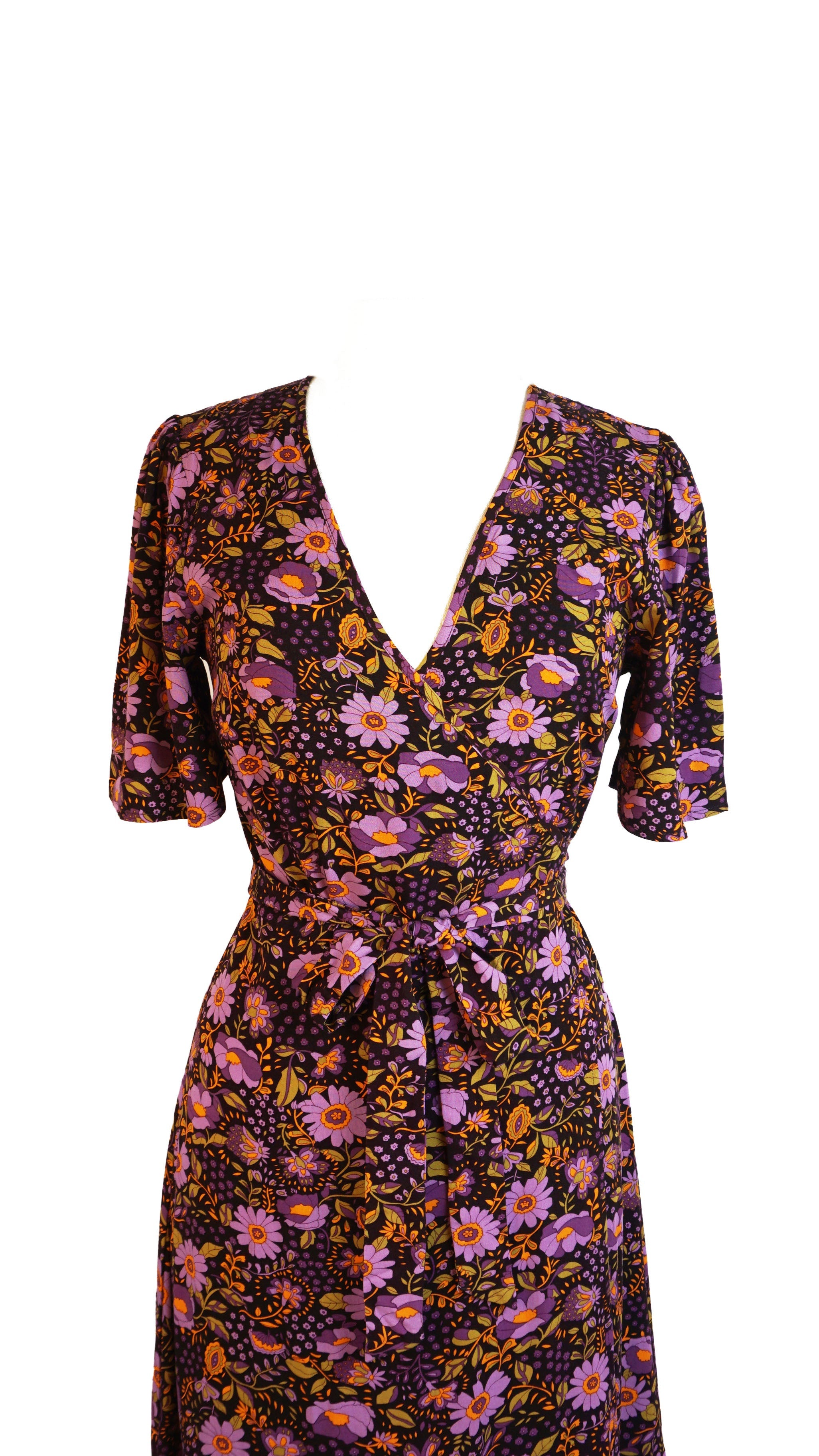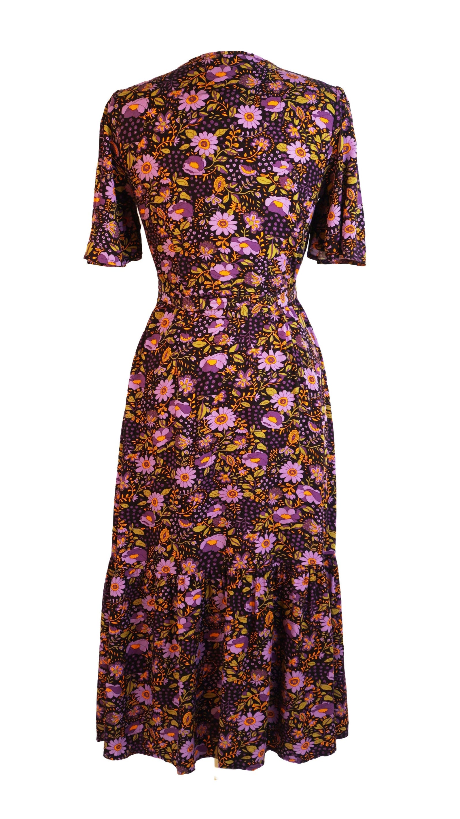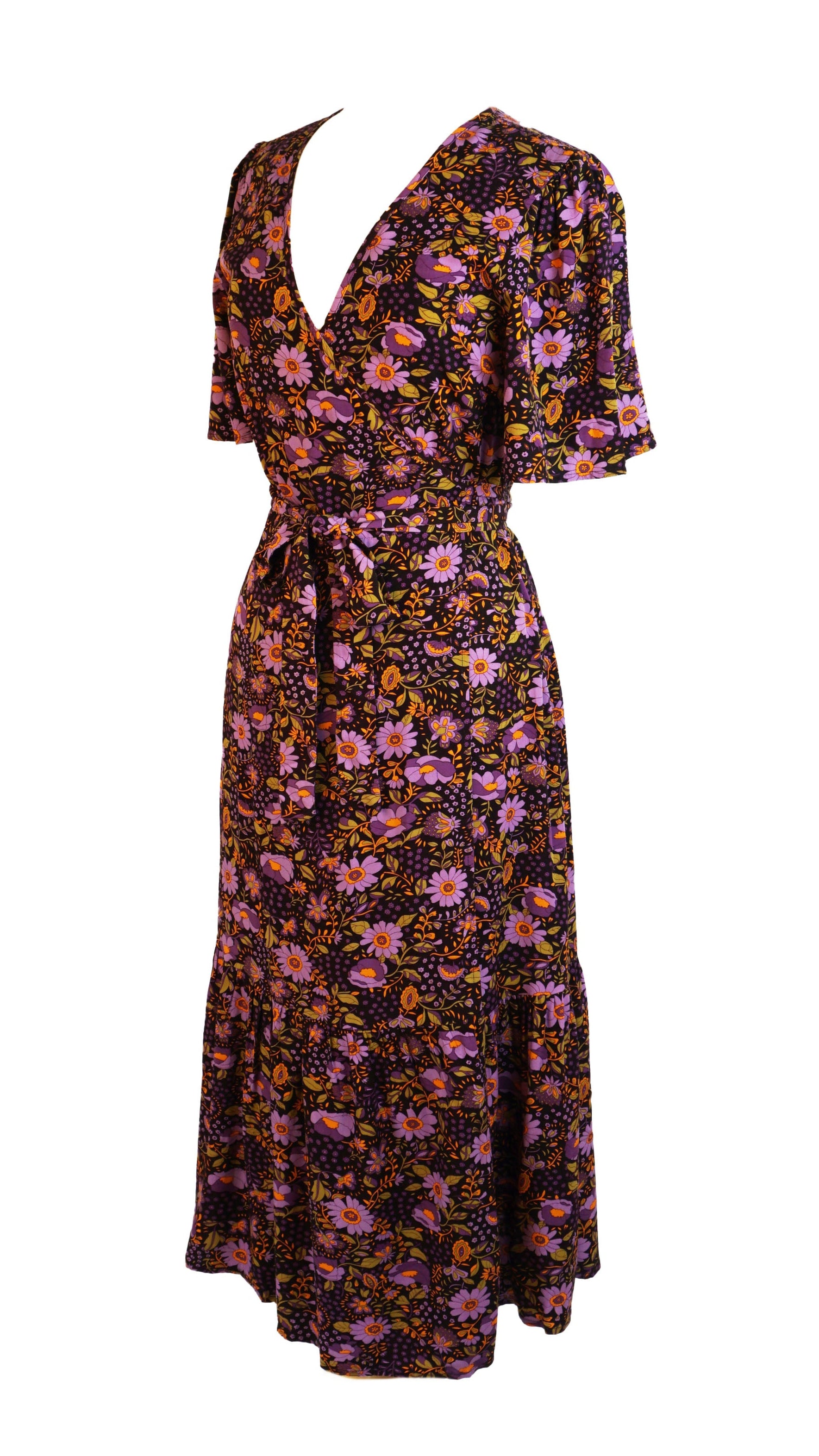 This Vintage floral mid length wrap dress is a customer favorite! In luscious rich tones that channel 70's vibes, this flattering fit is made of smooth viscose fabric, The skirt flows down below the knee, finished with a deep ruffle. Plum seems to be the color of this season, and this dress is the perfect staple!