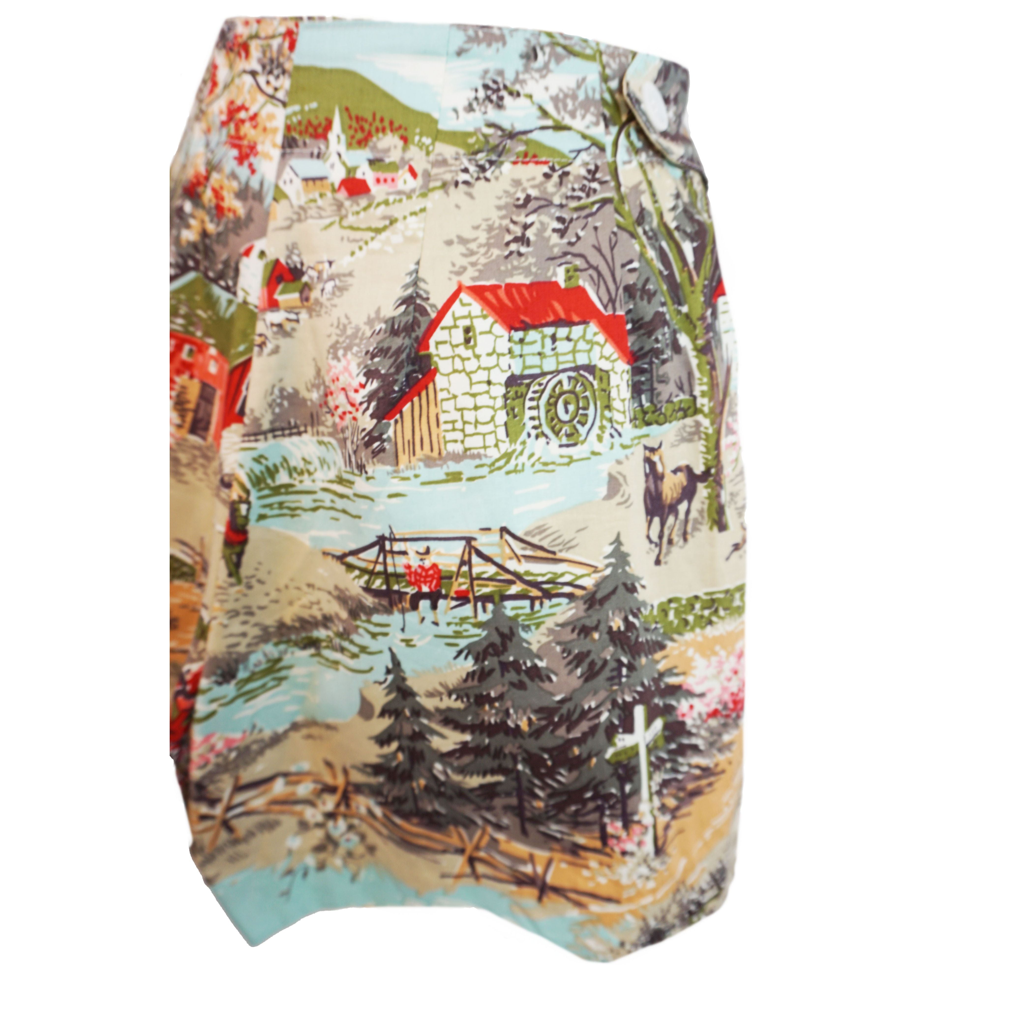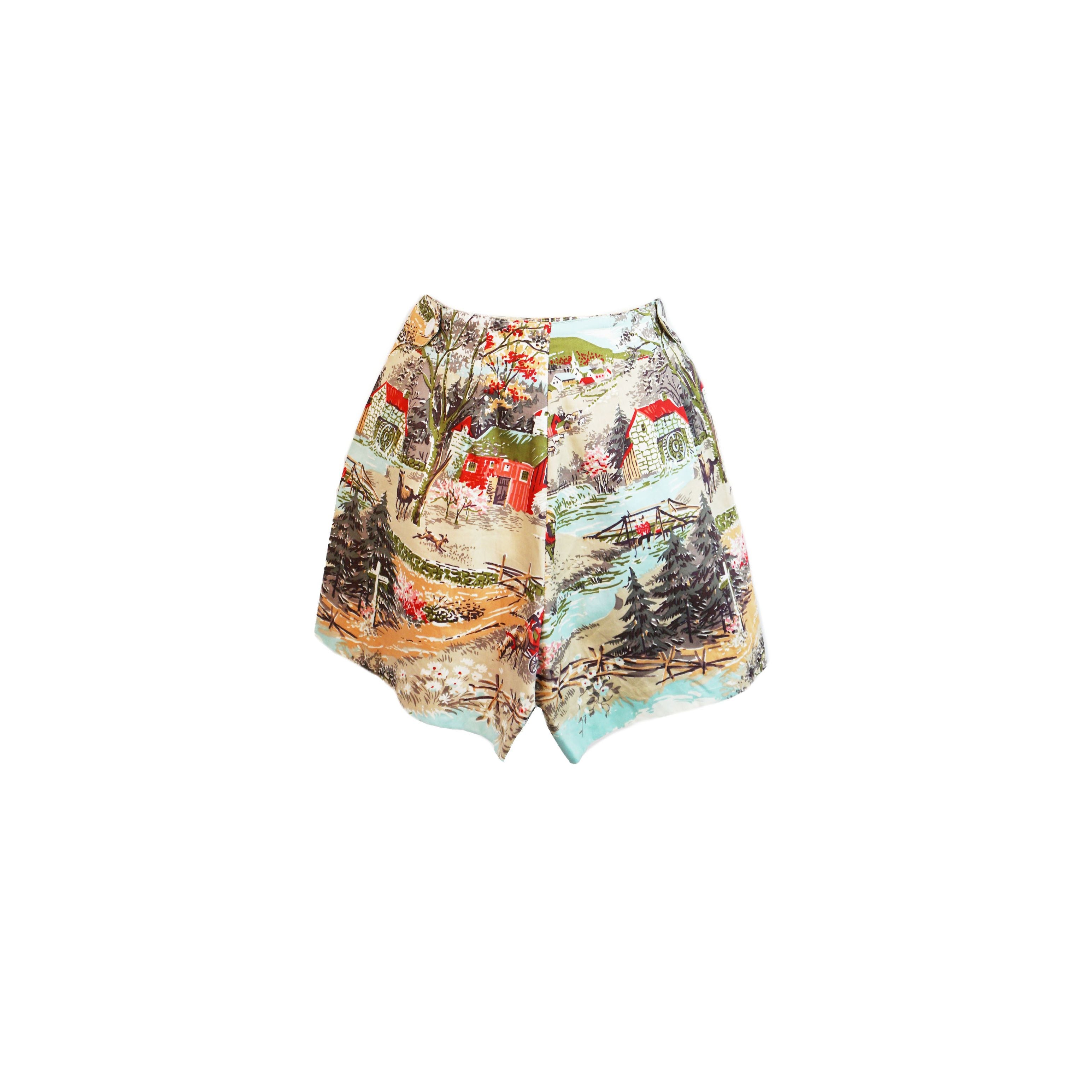 We can't get over how charming these 40’s Style Button Shorts are! Scenic country fabric, with the perfect shade of blue sky makes these high waisted shorts a must this summer! 100% Cotton