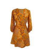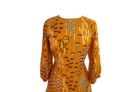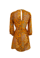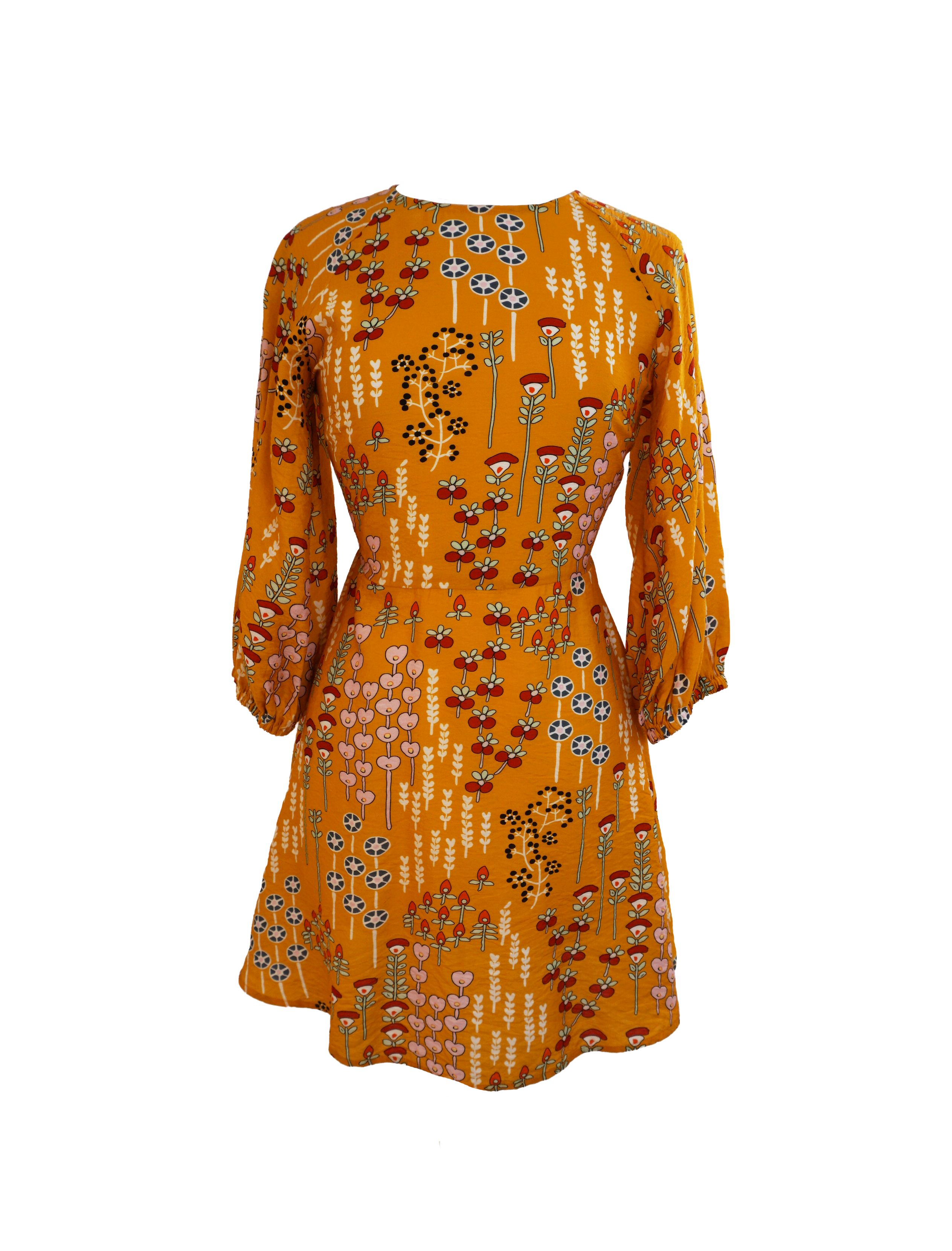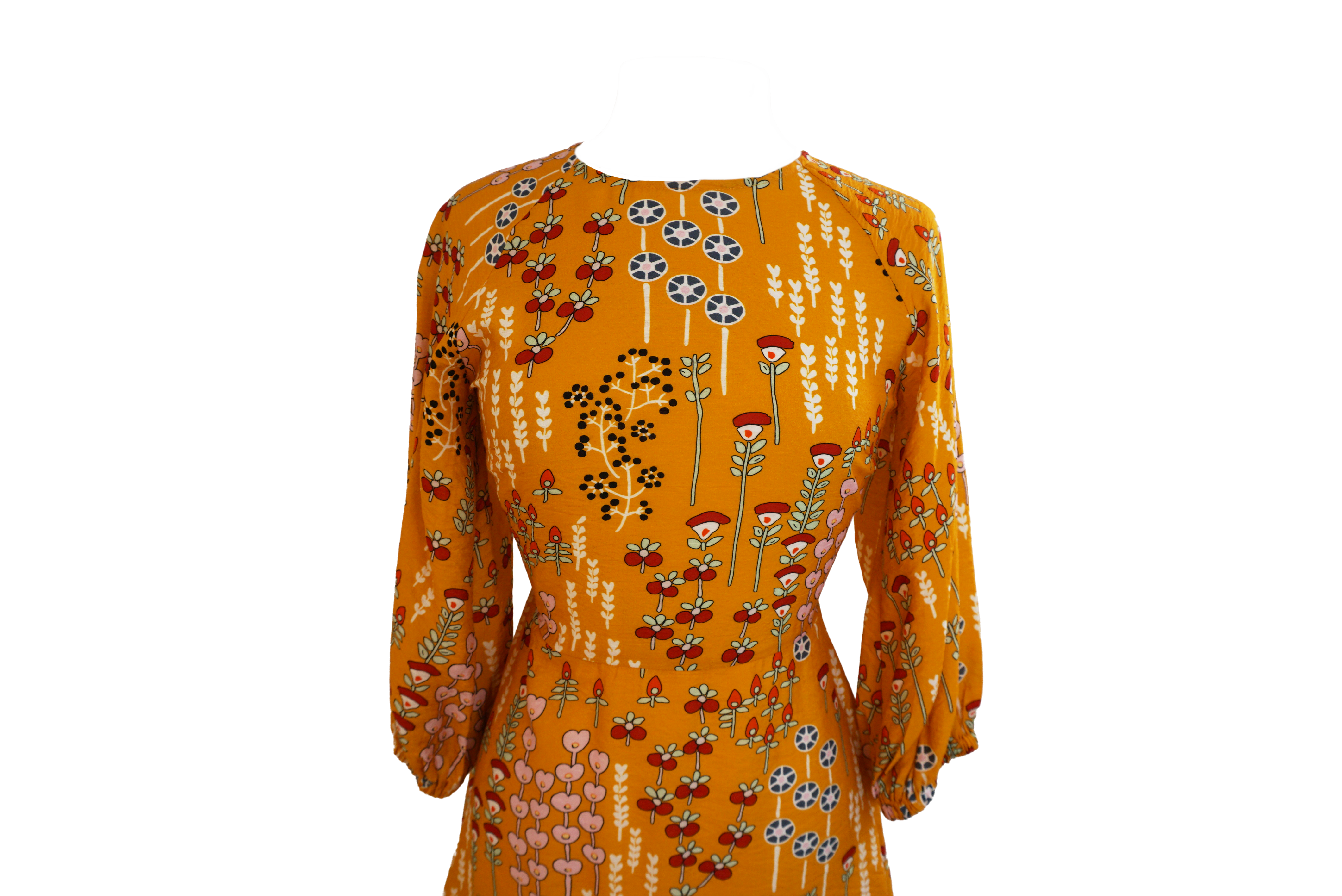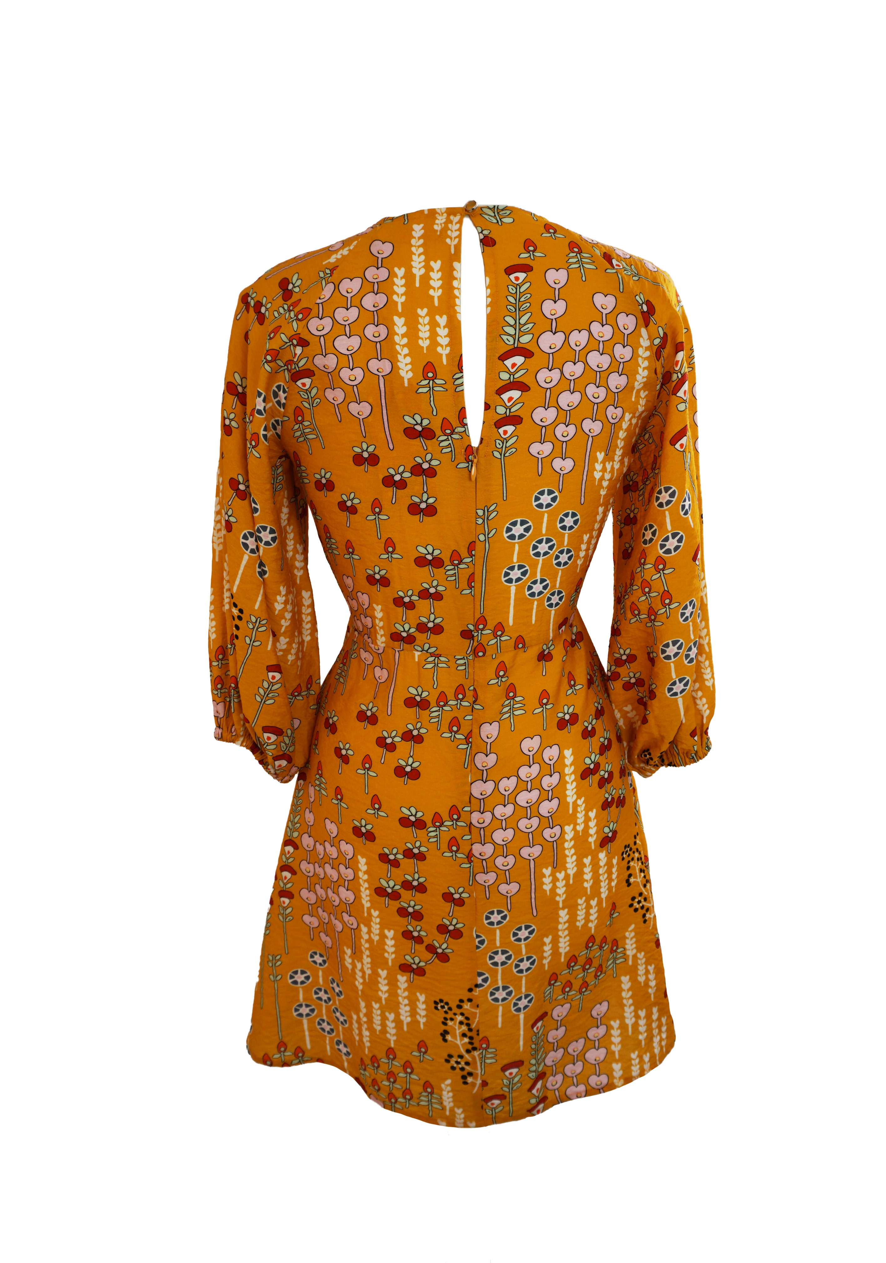 The Clara Dress in Mustard is the perfect Summer-to-Fall dress! Breezy enough for sunny days and perfect for layering with tights and jackets on the crisper days. The boatneck dress features puff sleeves and a flared hemline. A beautiful and flattering silhouette in a crisp folk art print. Quarter zip and peephole back fastening. 50% Viscose, 50% Polyester
