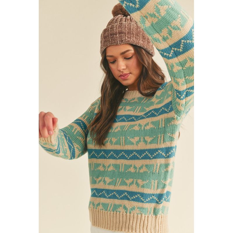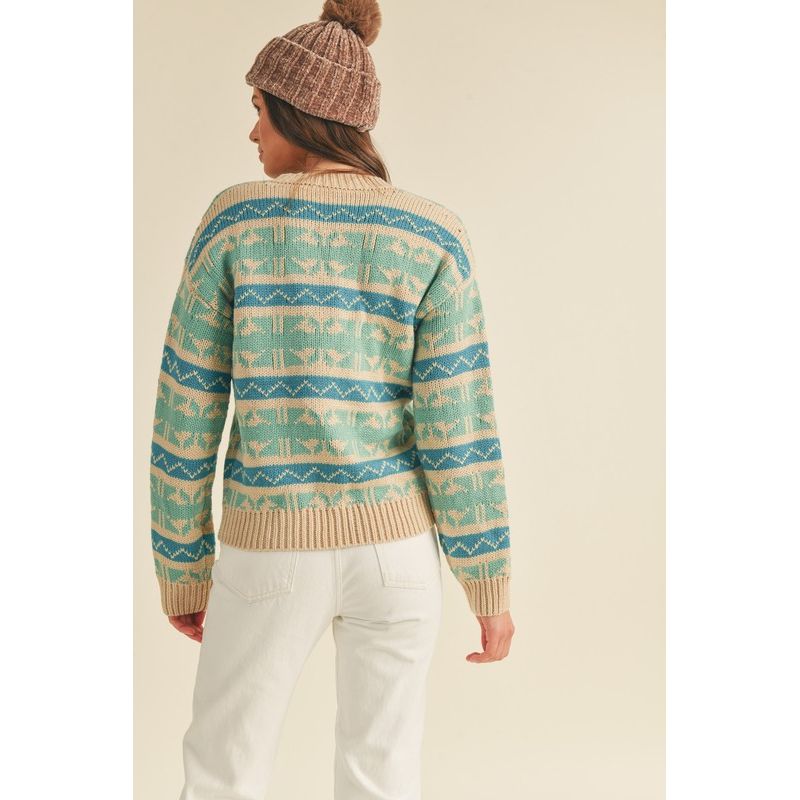 We love this abstract Faire Isle knit sweater! Warm and cozy, yet the mint and teal colors remind us that Spring is right around the corner. Ribbed neckline and hem make it the perfect fit for a casual day!