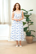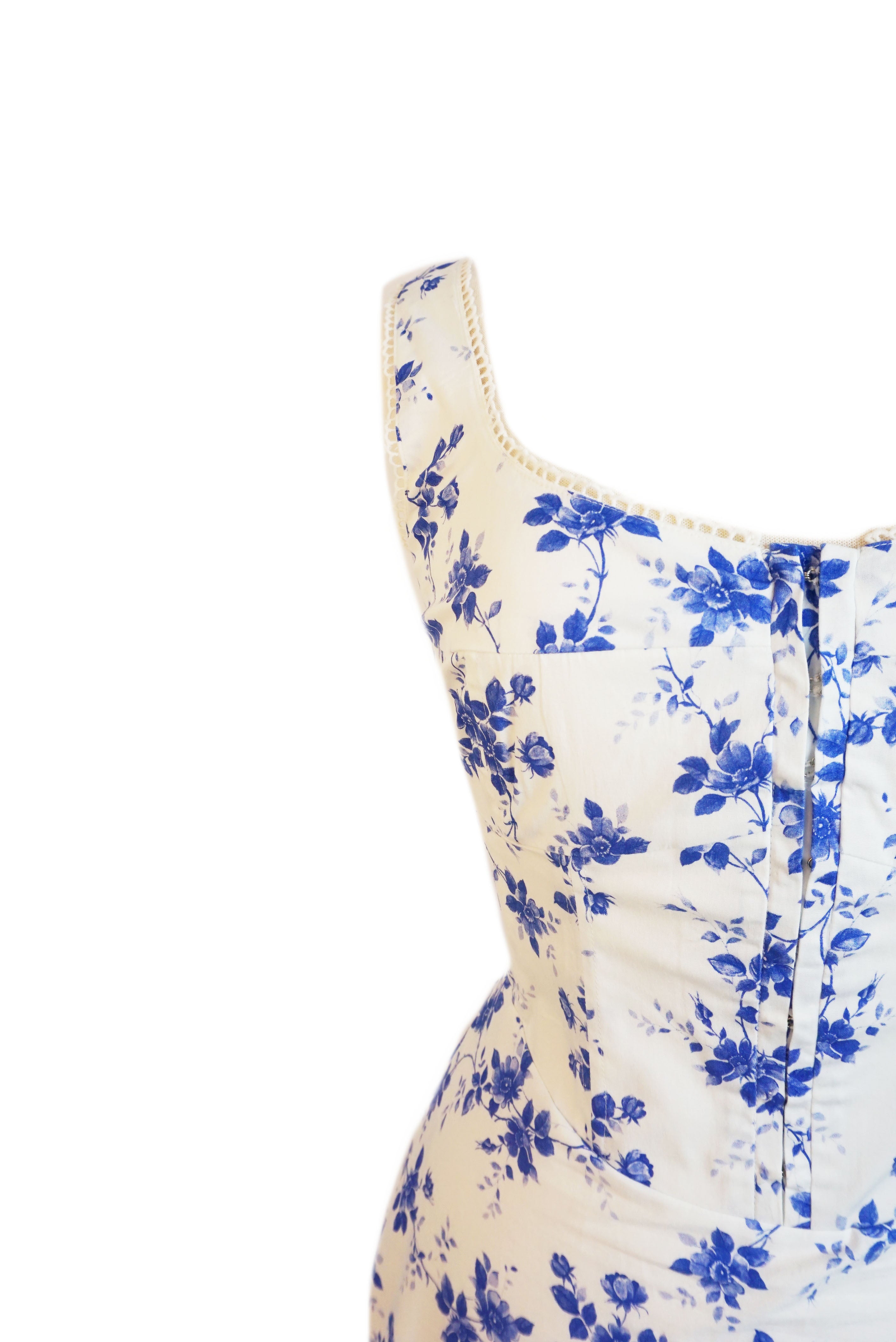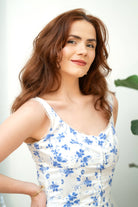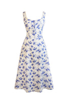 We are loving this sweet corset midi dress in white & blue! The fitted bodice and A-line skirt create a flattering silhouette, while back smocking and lace detailed curved neckline ensure a perfect fit. Made and lined with soft, BCI-certified cotton poplin elastane fabric, this is luxury fashion with a conscience.
