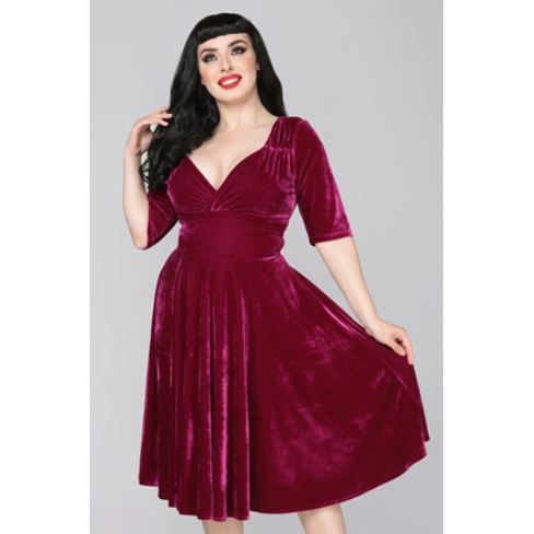 Your Dream Dress has just arrived! The Velvet Doll Dress in Magenta is a fabulous dress for this season. A classic shape from Collectif, the Doll Dress is a vintage inspired piece with elbow length sleeves, cross over bust detail, and ruching at the collar bones. She features a flattering fitted panel from under the bust to the waistline, and a full swing skirt - all in a rich colored velvet that will keep you cozy and looking fabulous!